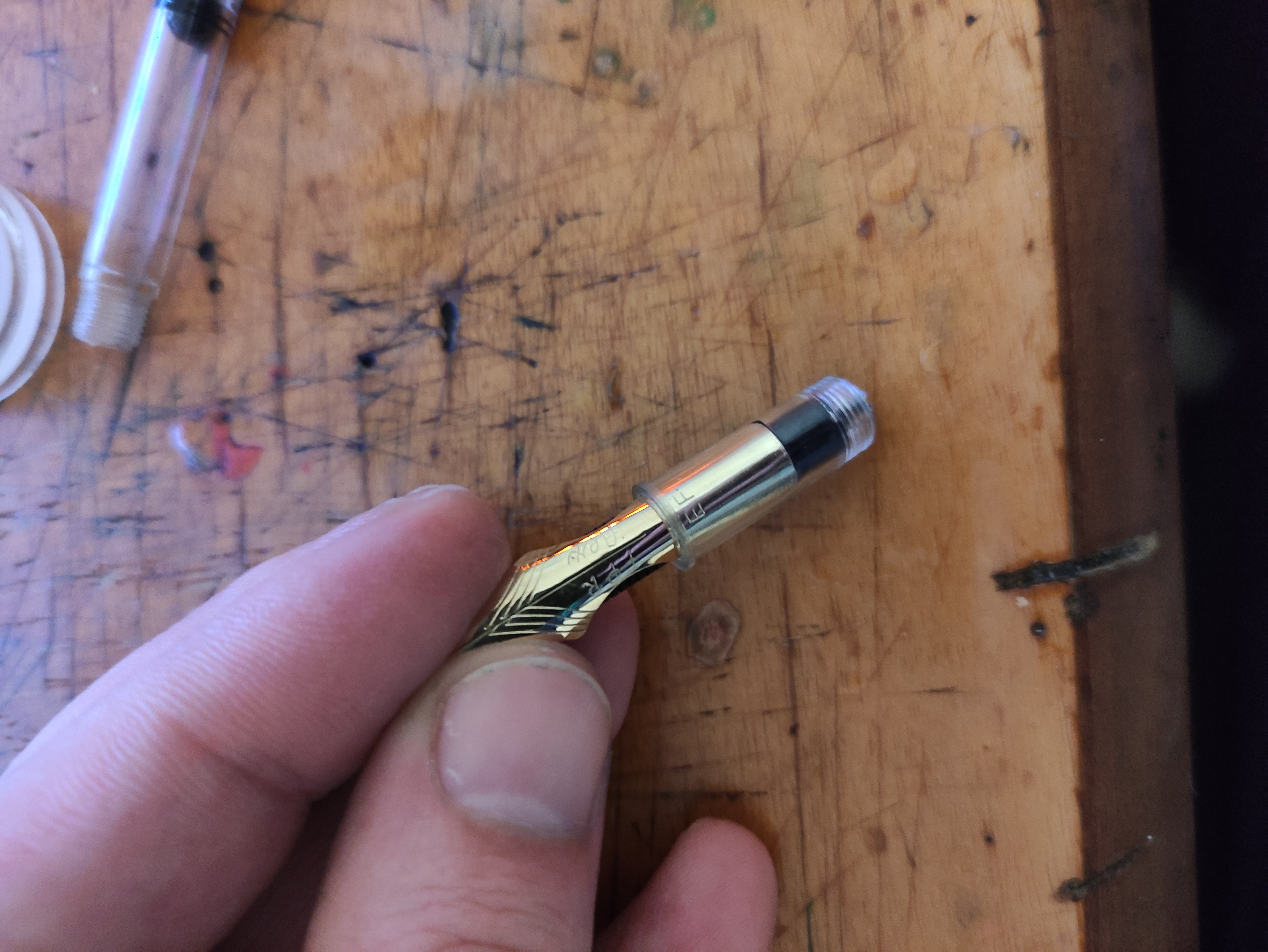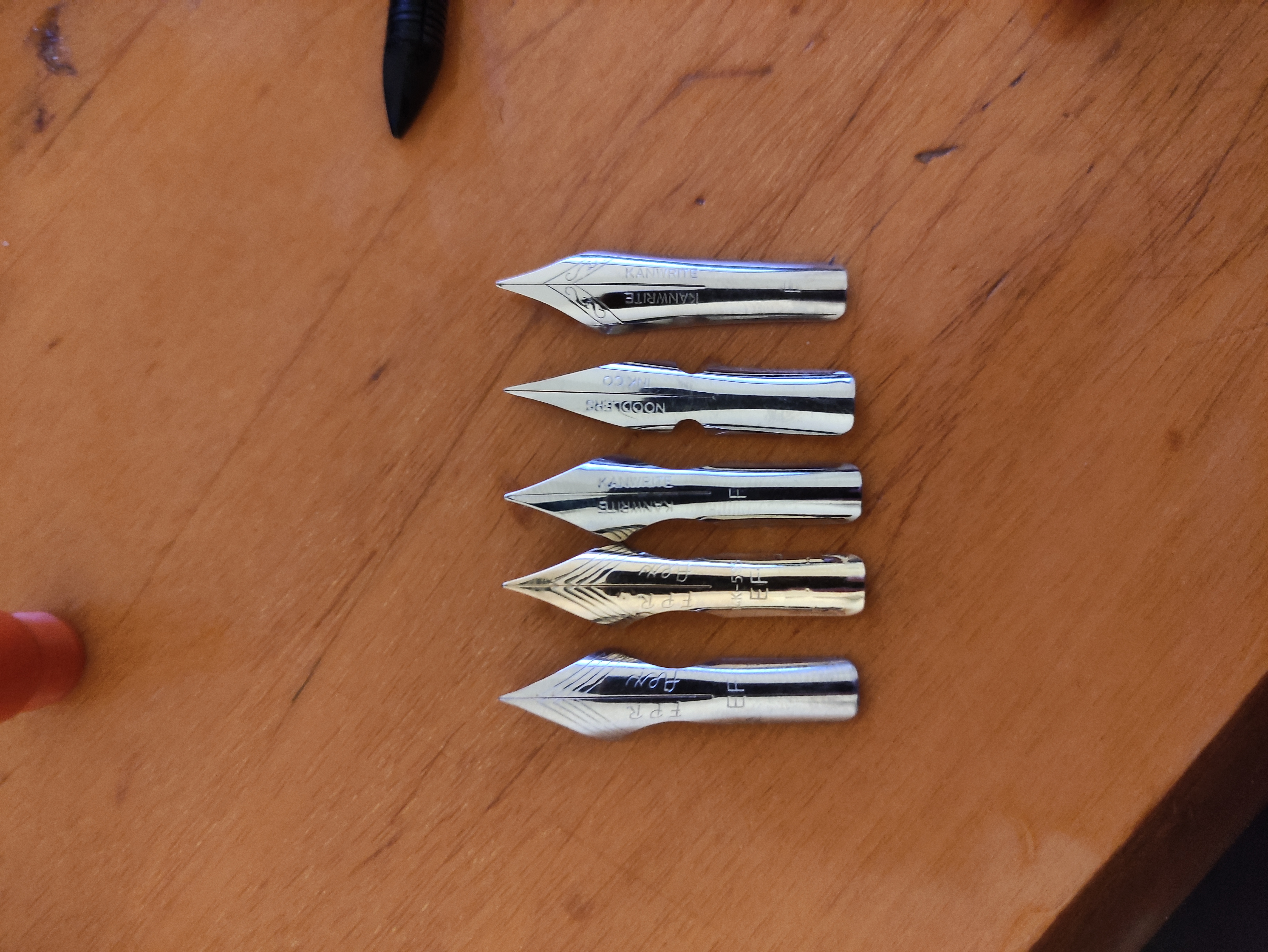 Qua trovate paragone tra i vari pennini kanwrite che io possiedo. Ho anche il pennino noodler che ho limato pesantemente siccome era meno flessibile. non penso farò la stessa cosa con questo della kanwrite siccome pare migliorato. Il kanwrite in dotazione con la penna è l'ultimo nella foto, lo si riconosce per l'assenza di tagli laterali.