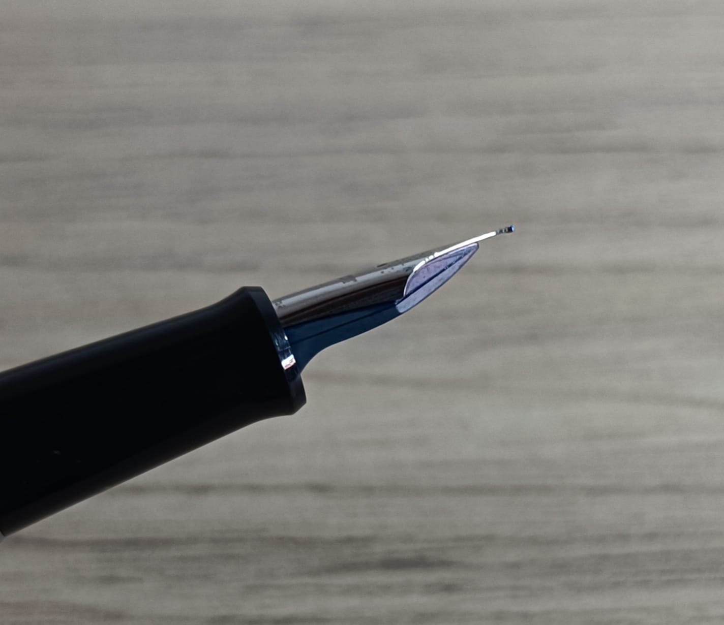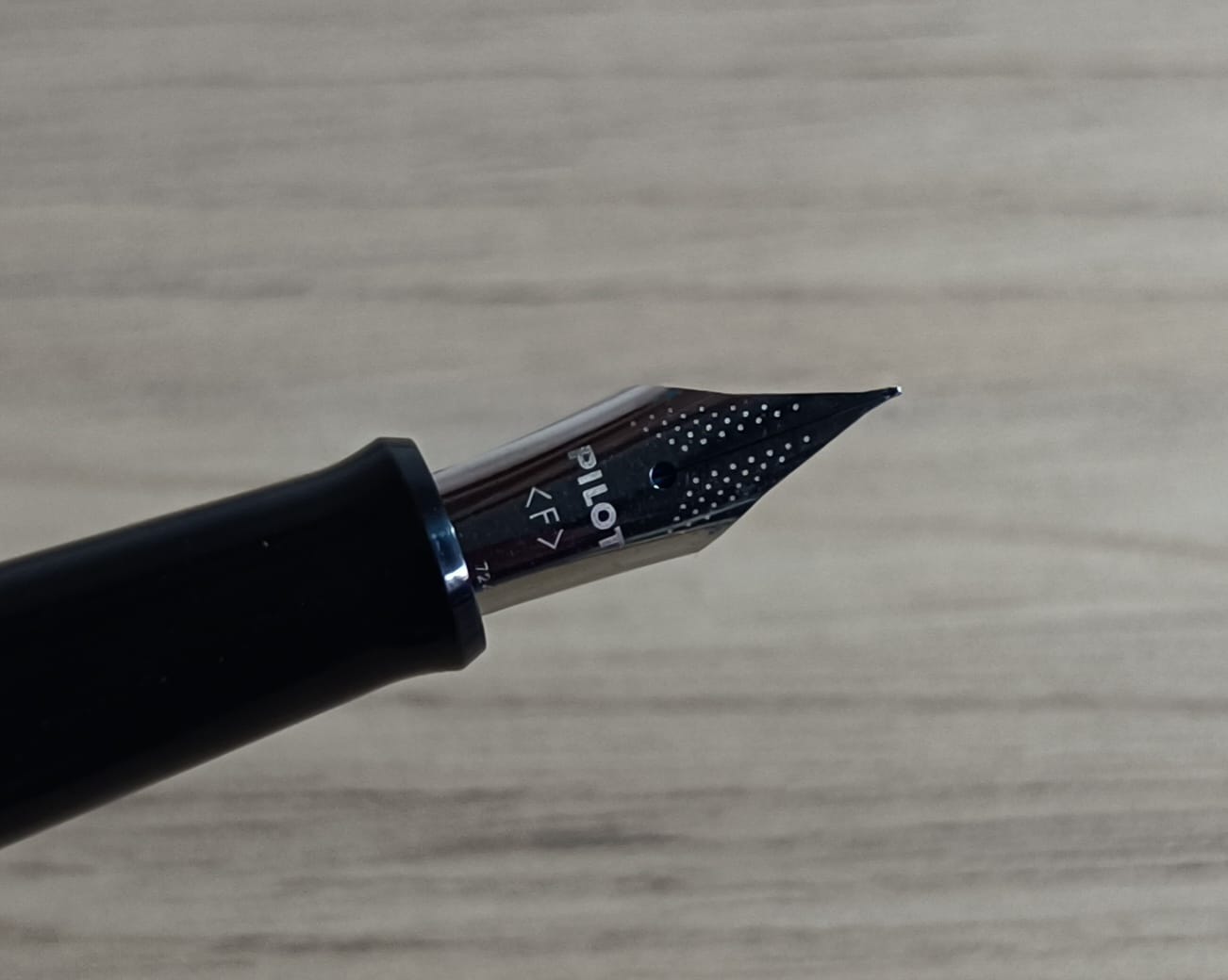 Descriviamo dunque il pennino: si tratta di un pennino in acciaio non grandissimo con foro di sfiato circolare, decorato nella parte finale dei rebbi con un motivo a pois, al di sotto del foro di sfiato troviamo la scritta “PILOT” e sotto l'indicazione del tratto, in questo caso un F. Al di sotto del pennino troviamo l'alimentatore, il classico modello per i pennini in acciaio Pilot, piatto e con righe parallele al di sotto, in plastica grigio-bluastra.