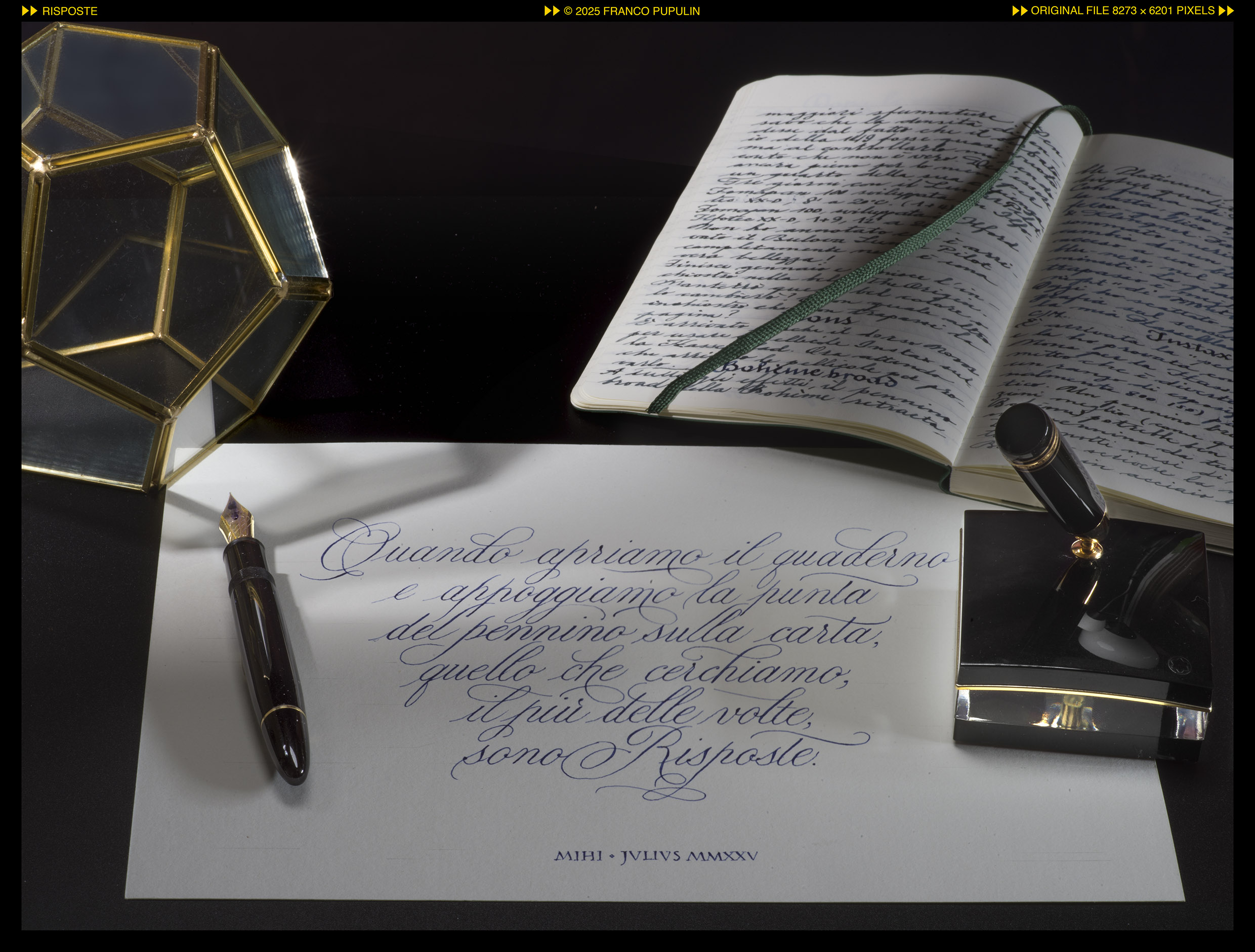 Aprire il quaderno, stendere il foglio, appoggiare il pennino sulla carta, é sempre un atto di curiosità e di scoperta, un viaggio verso se stessi di fronte all’ineluttabile alterità dell’universo intero. Scrivere é una ricerca di risposte a tutte le domande.