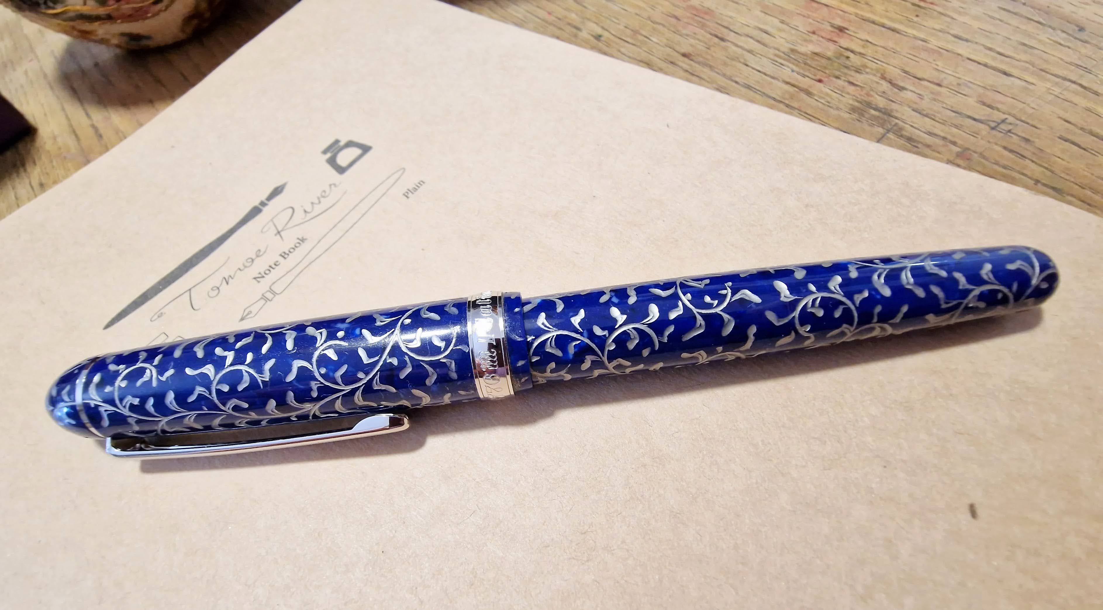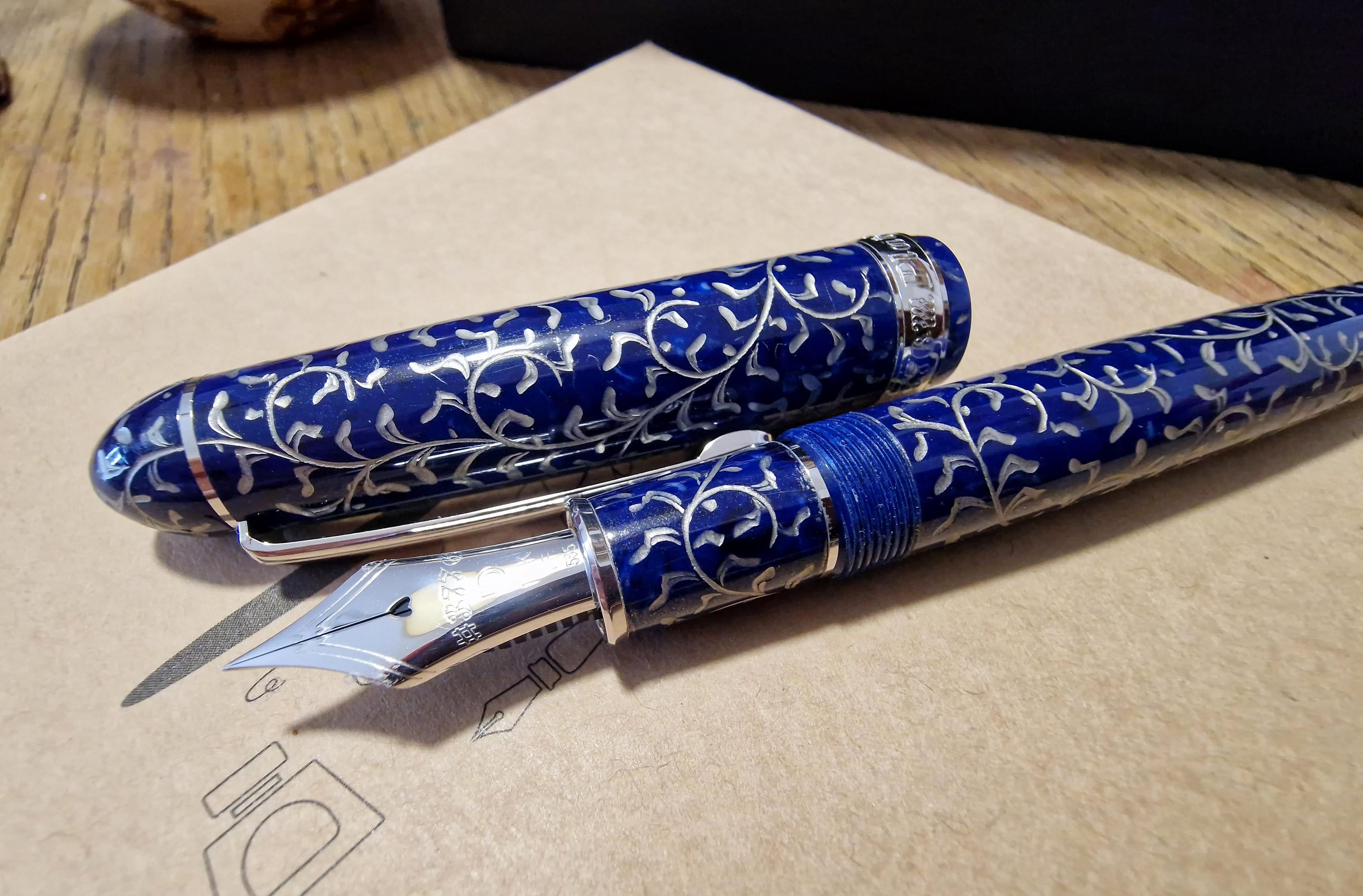 La Platinum 3776 Century Blue Celluloid Chinkin Karakusa è una classica Platinum 3776 nella forma. Una penna ogivale, con la tipica clip Platinum.