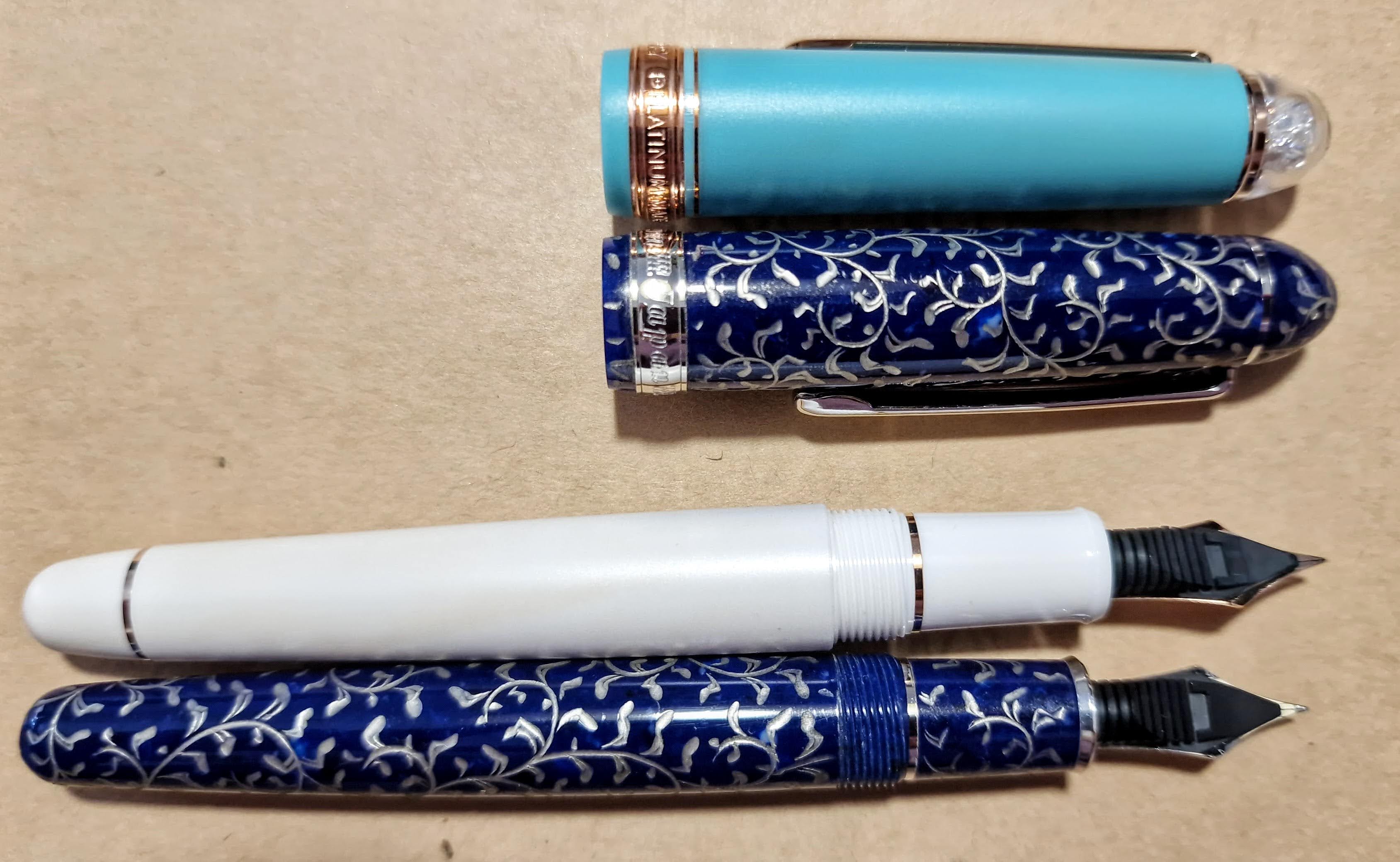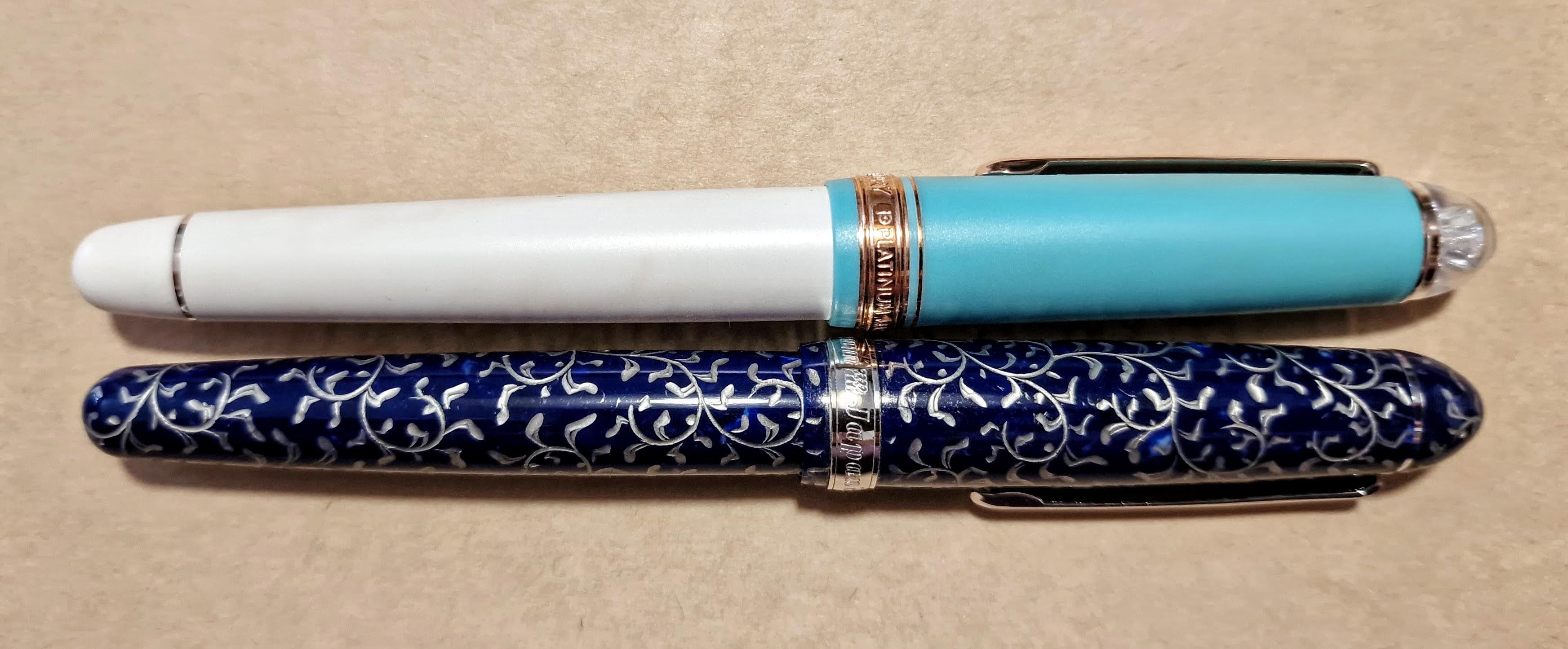La penna è in celluloide blu royal con saltuarie inclusioni bianche, che ne rendono la presentazione meno ovvia di quanto sembri da lontano. Il materiale di lavoro ricorda quella del modello 3776 Century Midnight Ocean Blue Celluloid ma non sono in grado di dire se sia davvero lo stesso materiale. Basandomi sulle foto online, in alcune la Midnight sembra più scura, in altre sembra uguale. Anche la Midnight, tuttavia, ha una celluloide blu con sparse inclusioni bianche. Può essere una coincidenza o a Platinum piace in modo particolare tempestare di bianco le sue celluloidi blu.