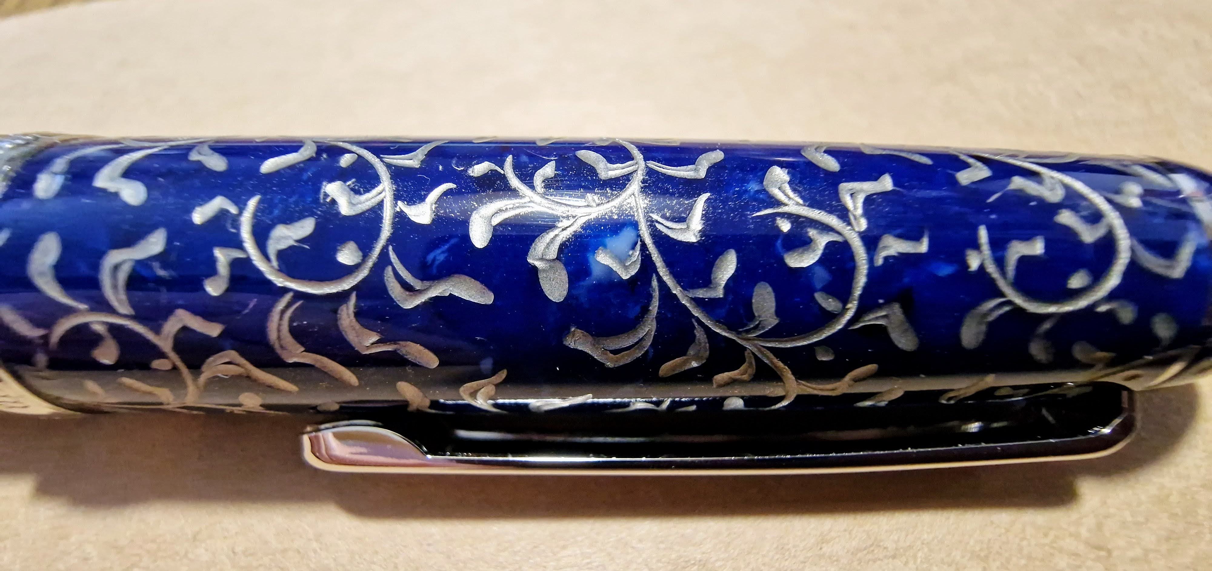 Io non sono obiettiva nel commentare la minuteria, visto che preferisco il rodio a prescindere, ma in questo caso mi sento di dire che si accompagna a questo blu in modo davvero sopraffino. La penna è elegante, sofisticata, sicuramente barocca ma non pacchiana. Il blu con l'oro, forse, avrebbe dato maggiore impressione di ricchezza ma sarebbe stata, a mio parere, troppo opulenta e, forse, addirittura volgarotta. L'argento e il rodio danno una luminosità davvero piacevole.