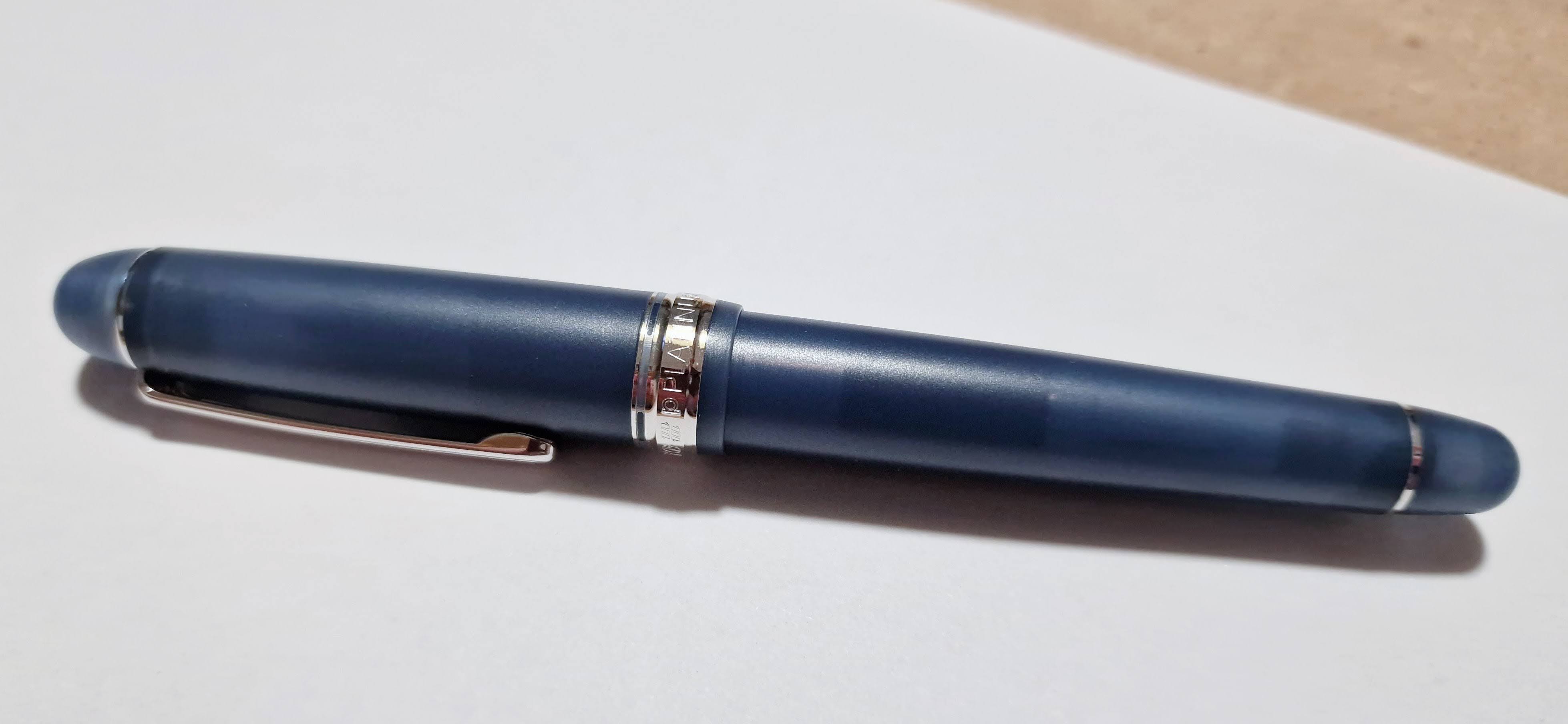 Questa penna si presenta di colore blu medio neutro, leggermente desaturato. La resina è sabbiata e traslucida. I trim sono in rodio. Ho scelto il pennino EF
