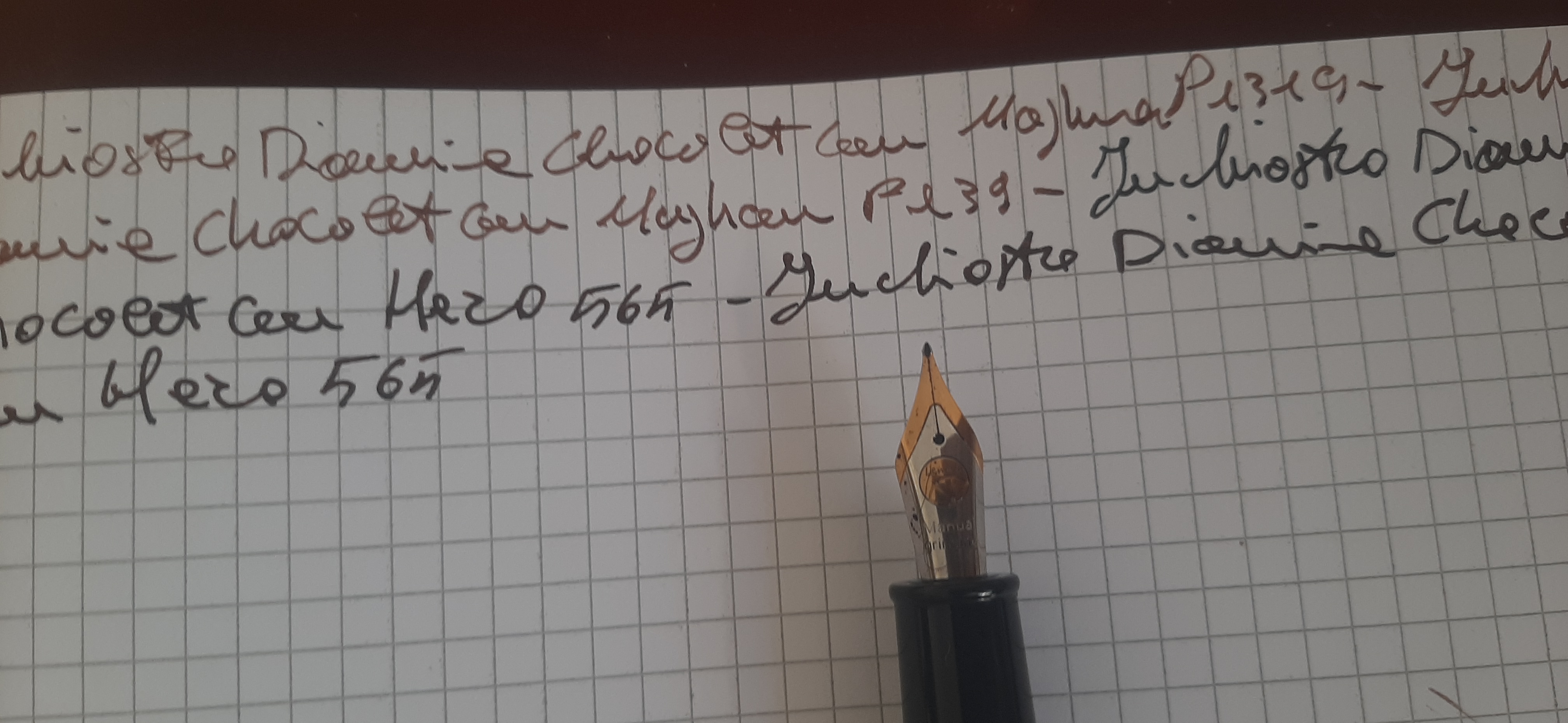 Guardate che differenza di resa; con la Majihon P 139 il Diamine Chocolat diventa un marroncino "slavatello"; evidentemente l'apporto di inchiostro in relazione all'ampiezza del tratto è molto misurato ( intendiamoci, il pennino scrive bene e per alcuni, o su alcuni inchiostri, ciò potrebbe anche risultare positivo). Vorrei acquistare per questa P 139 un altro pennino ( evidentemente più bagnato) da alternare a quello montato (Lemon naginata). Dovrebbe essere misura o misura F abbondante o M, tutto color oro o bicolore; intendo acqistare il blocco pennino + alimentatore + collettore. Su Ali non riesco a trovarlo (lo trovo solamente per la misura # 8), probabilmente perché non sono capace di individuare quelli adattabili. Mi potete aiutare indicandomi dei riferimenti ? Nella P 139, poi, il pennino si svita ? Vi ringrazio come sempre.