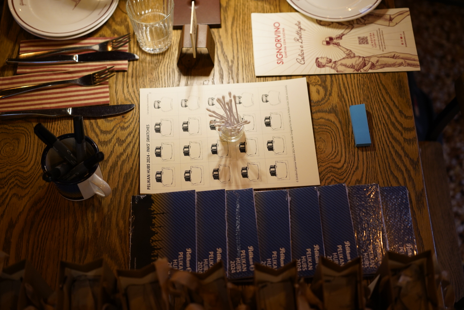 C’è l’angolo dello scambio inchiostro (ne porti uno che non ti piace e ne prendi un altro che vuoi provare), c’è un po’ di carta con cui pasticciare, ma soprattutto ci sono appassionati come te con cui fare delle chiacchiere.