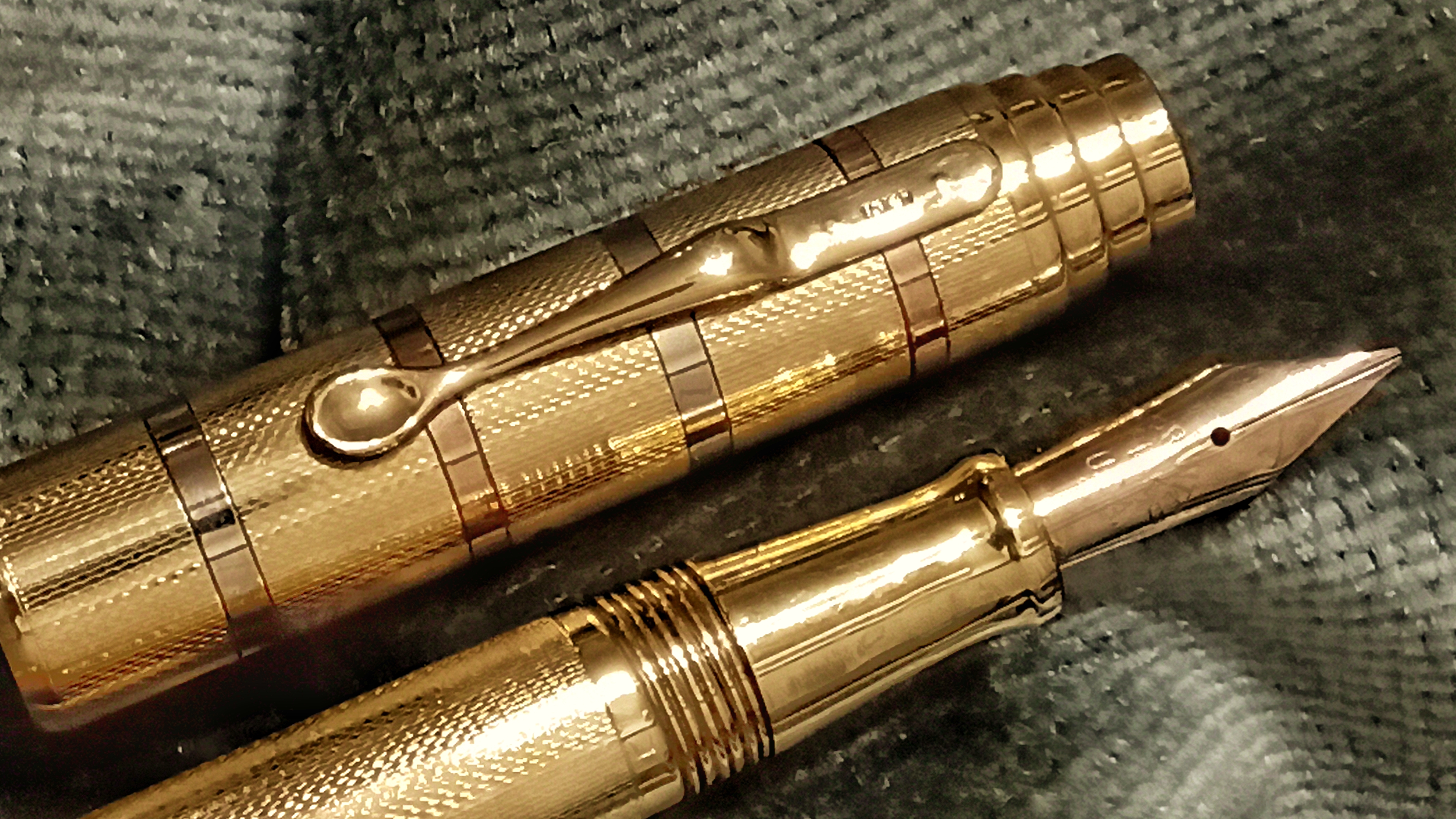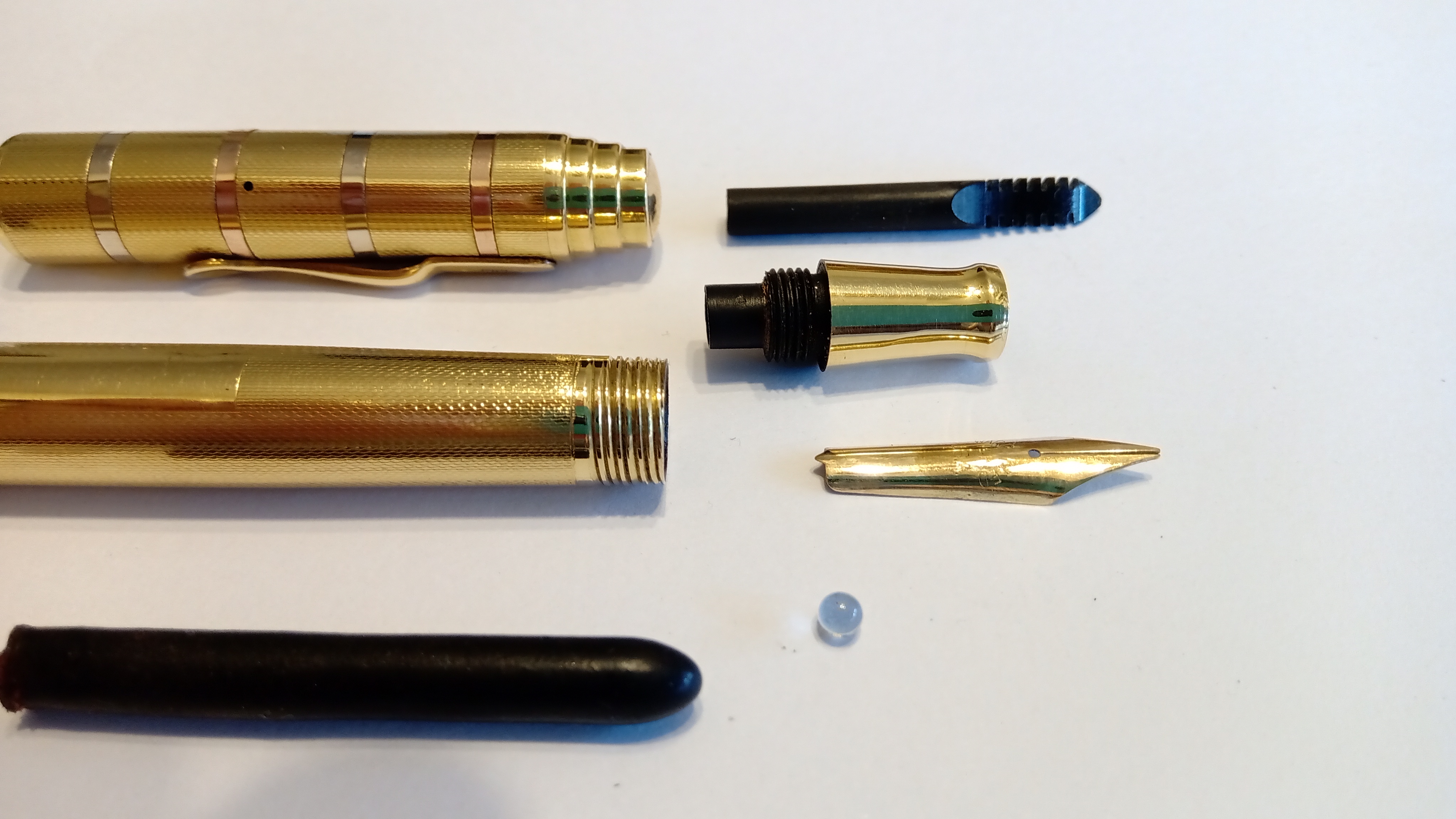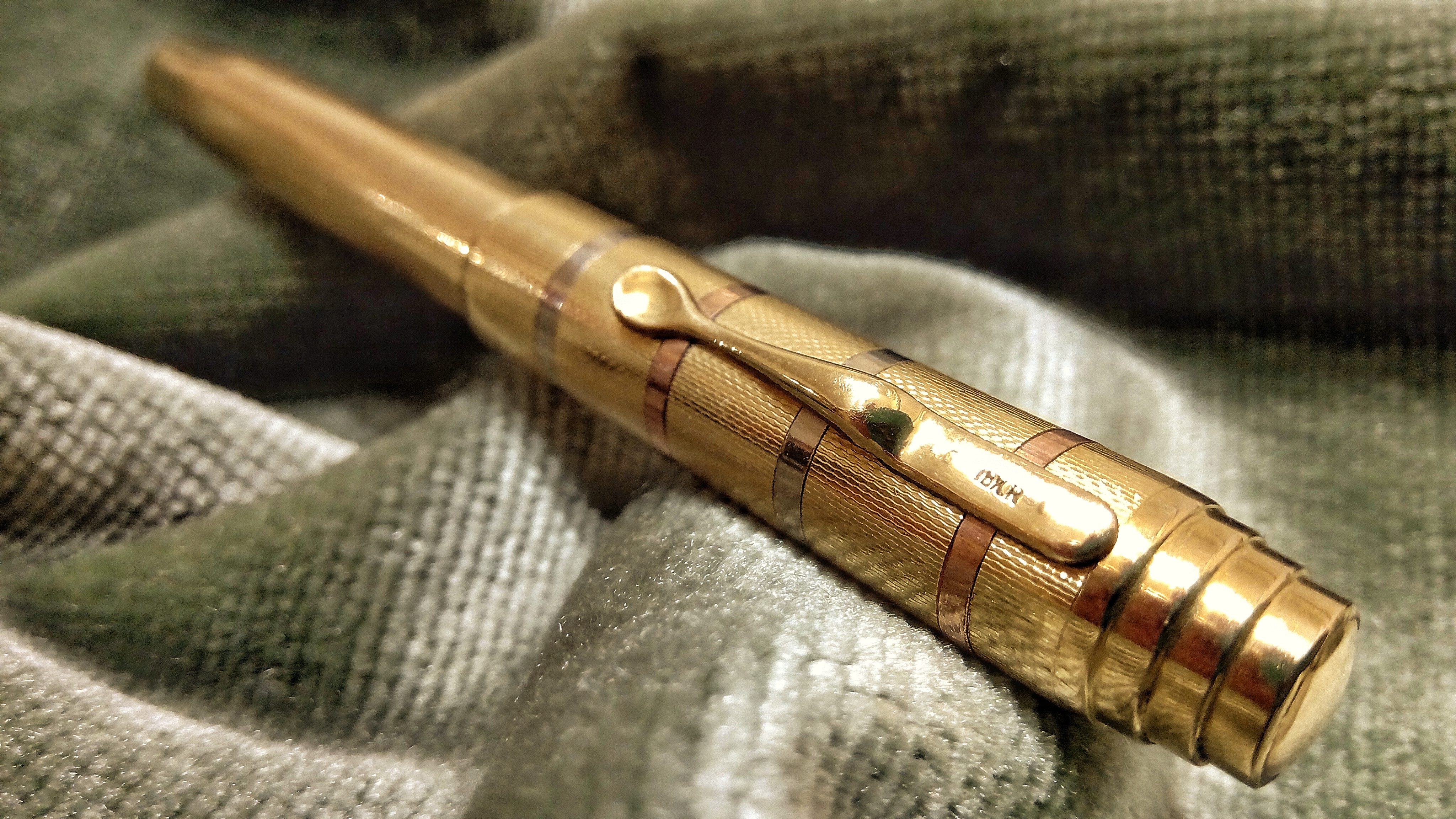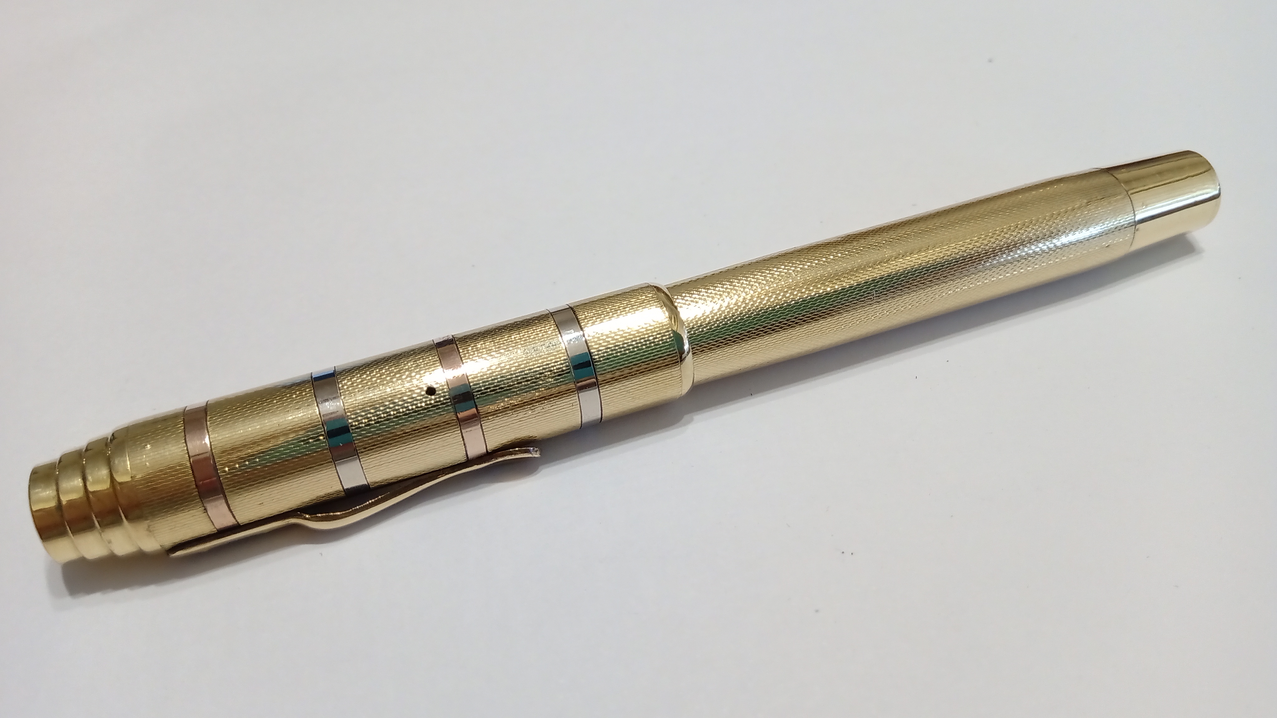 Ho quindi iniziato con un'interessante penna probabilmente realizzata artigianalmente su richiesta, più di settant'anni fa, del tipo All Metal, con caricamento a pulsante, interamente placcata in oro, con clip 18k rivettata del tipo a cucchiaio e cappuccio a vite con intarsi in rame e nichel...