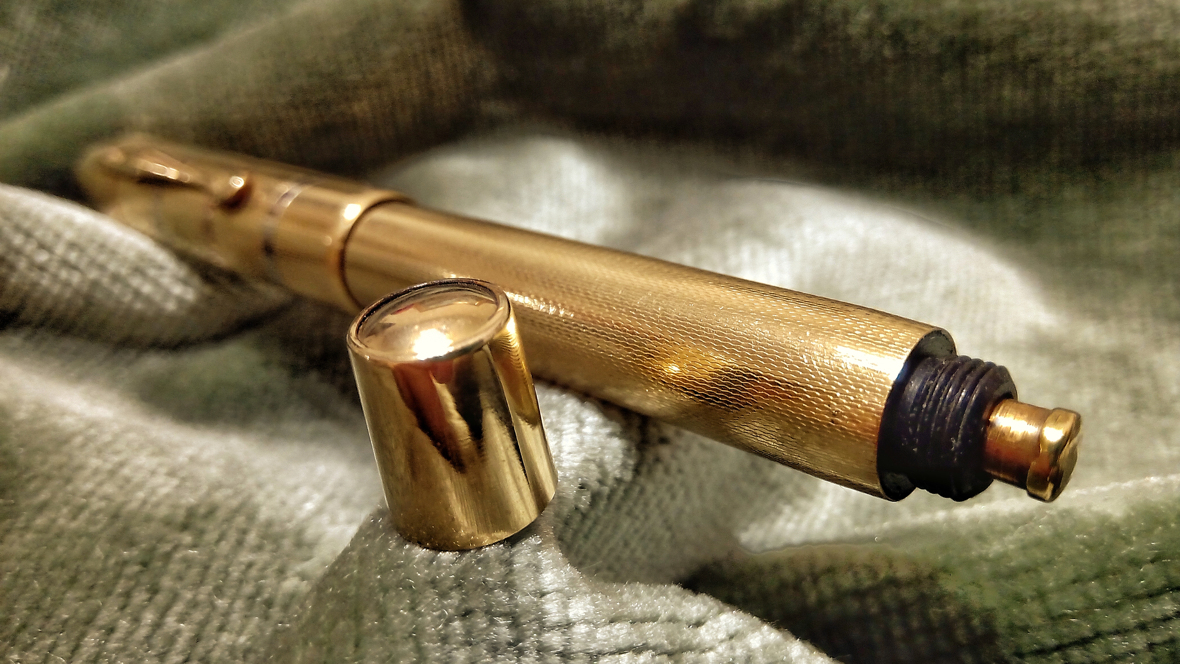 Comencé entonces por una interesante pluma probablemente fabricada artesanalmente a pedido, hace más de setenta años, del tipo All Metal, con carga a pulsante, totalmente bañada en oro, con clip 18k remachado del tipo cuchara, y un capuchón a rosca con incrustaciones en cobre y níquel...