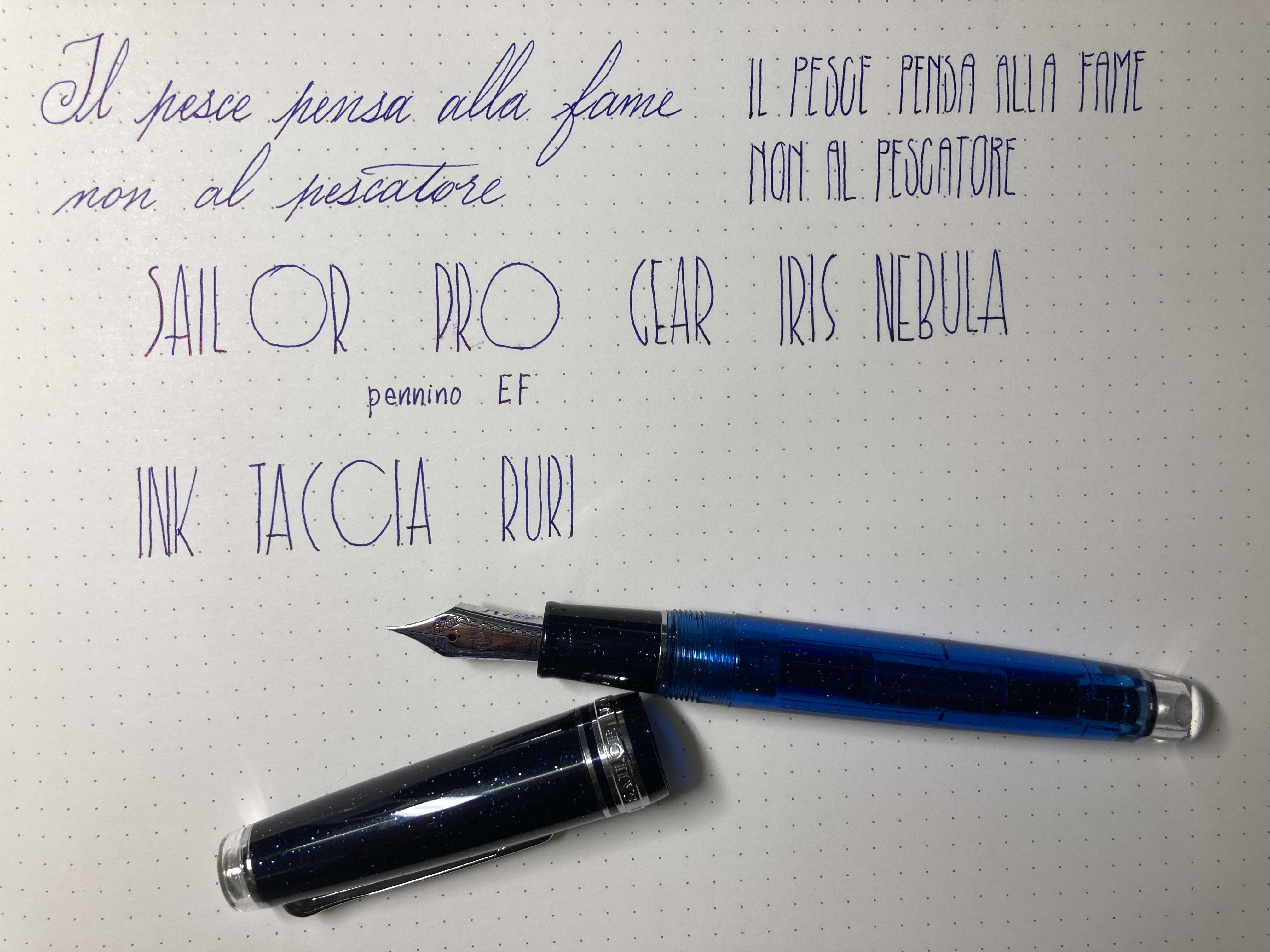La scelta di questa colorazione, Iris Nebula, perchè il blu è il mio colore preferito ma non ho molte penne di questo colore, è stata impulsiva, l'ho vista disponibile sul sito e dopo un piccolo consulto telefonico chiarificatore con la gentile signora del negozio ho schiacciato il checkout con pennino EF.