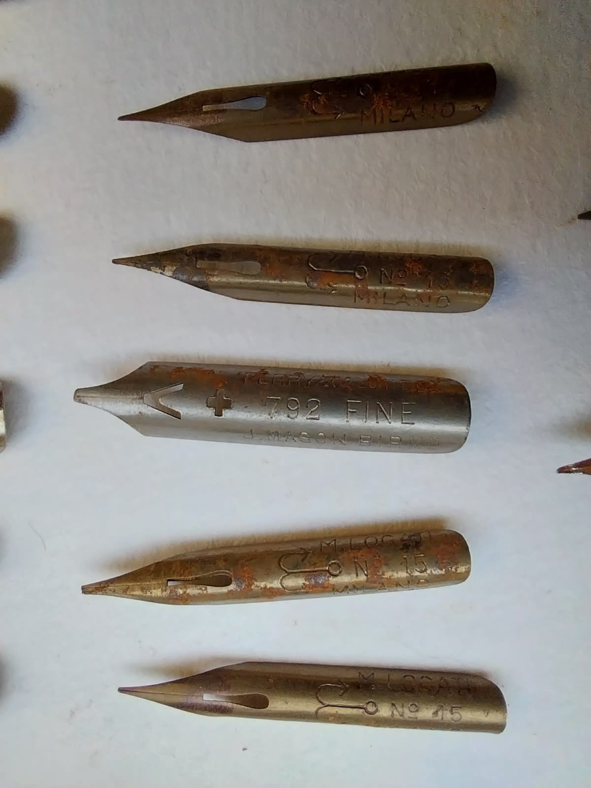 Solo per la curiosità, la cugina (di cui parlo altrove) aveva conservati questi vecchi (e arrugginiti) pennini, che non mi paiono da intinzione.