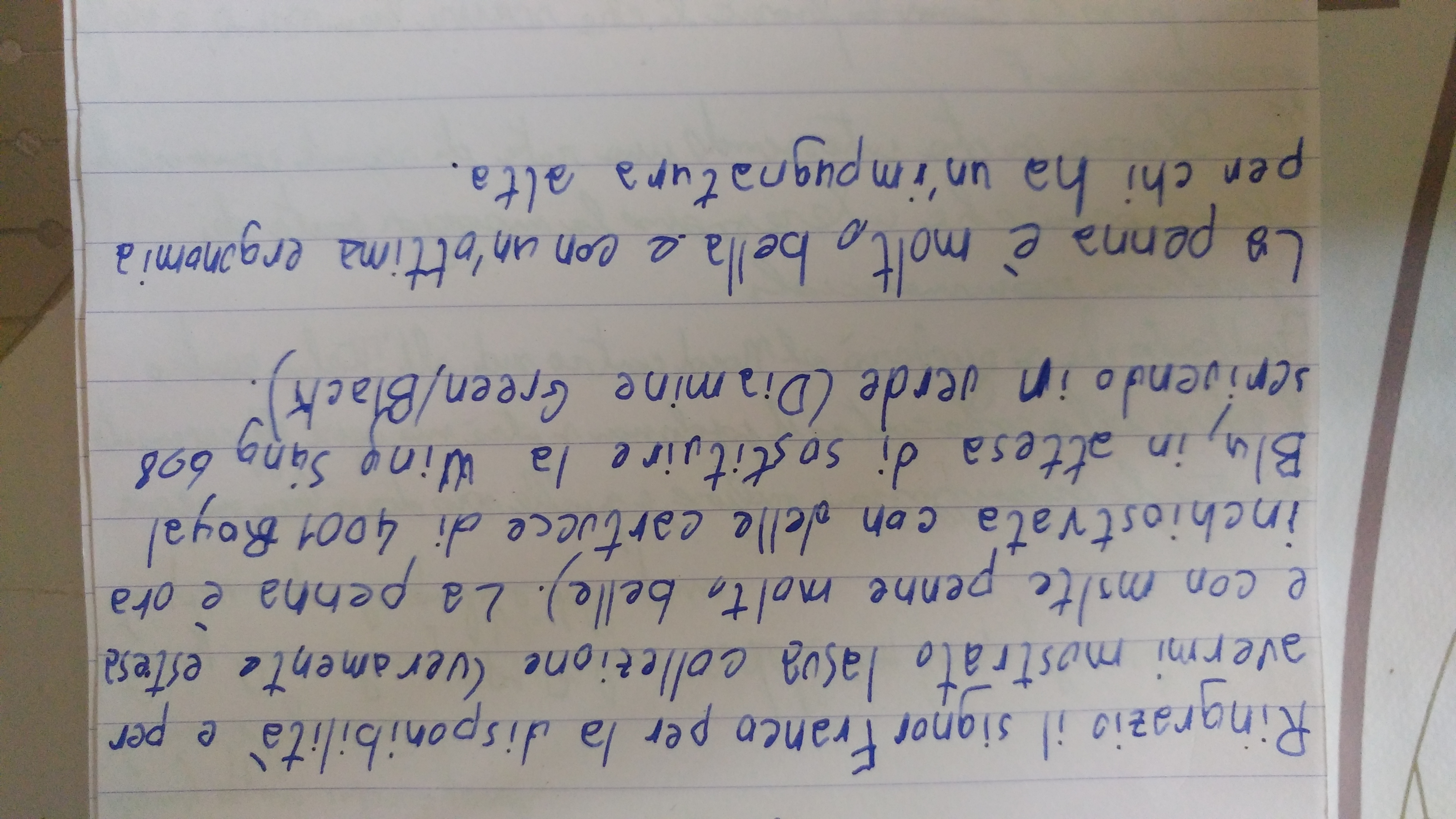 Userò per il momento la penna a cartuccia per poter finire quanto prima le scorte di 4001 Royal Blue, e Rosso e Diamine Green Black, per poi passare a qualche inchiostro resistente all'acqua.