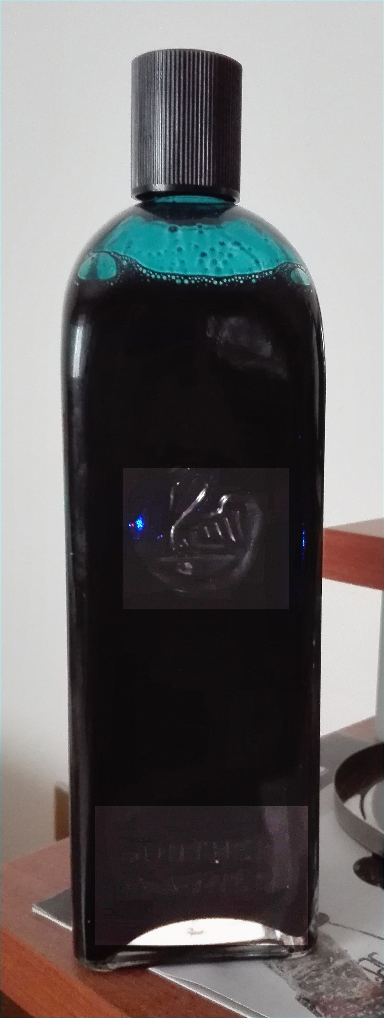 La bottiglia è molto bella, priva di qualsiasi etichettatura cartacea , il marchio con il pellicano è riportato sulla sommità del tappo e impresso direttamente nel vetro insieme al nome Günther Wagner.