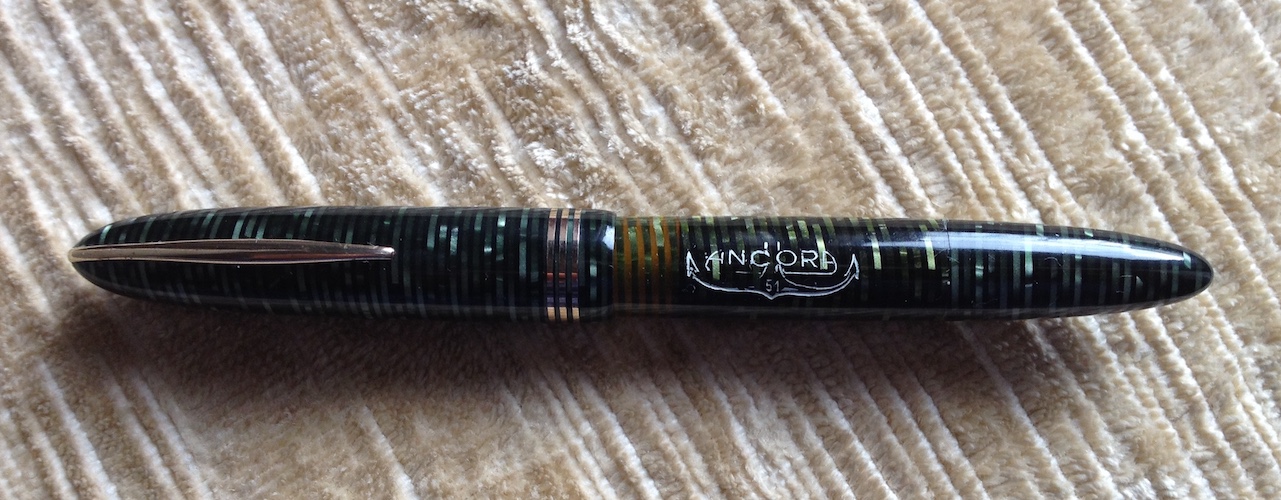 Modello 51 in celluloide anellata con corpo trasparente, cappuccio laminato oro, classica ancoretta sulla clip
