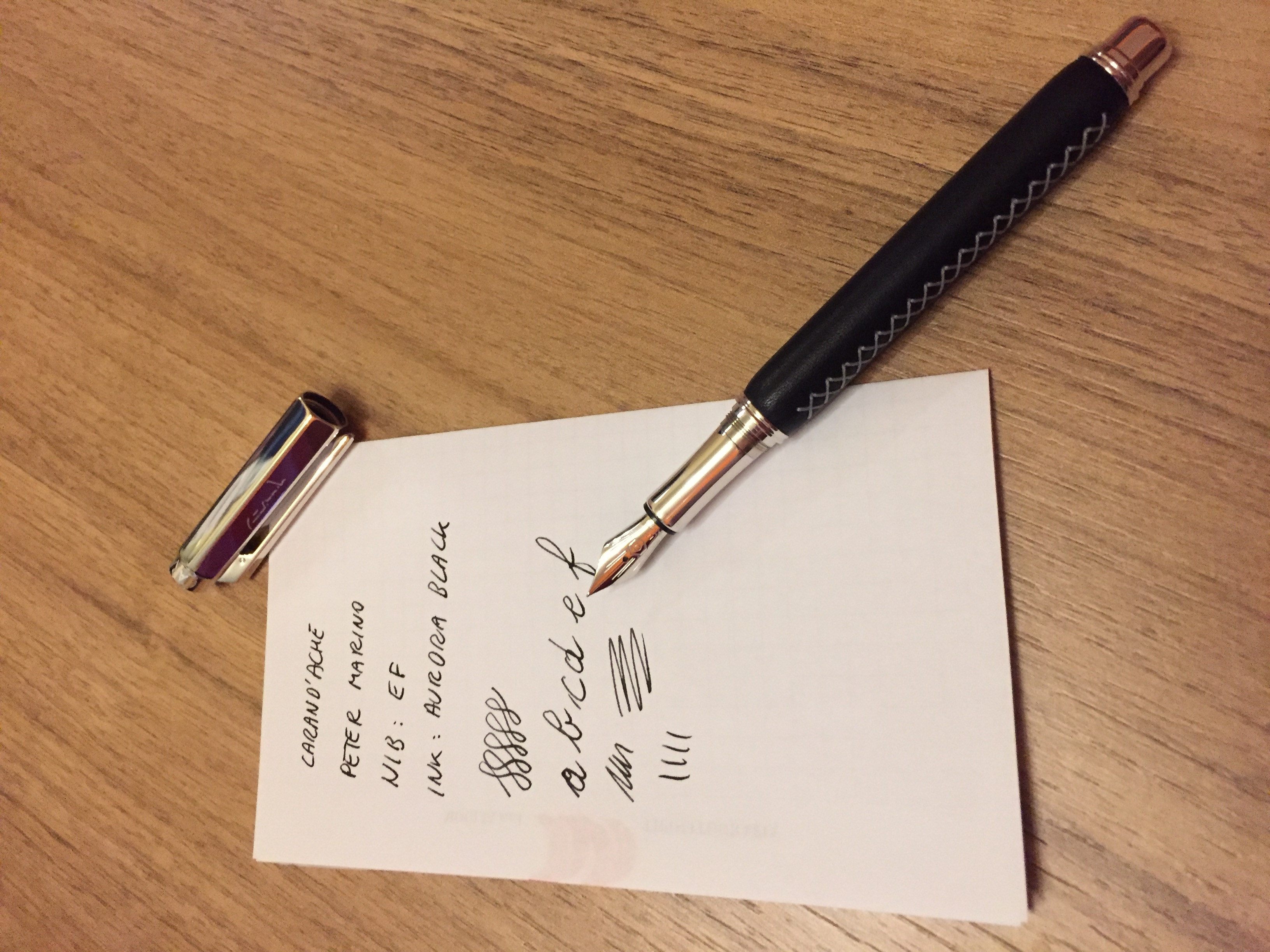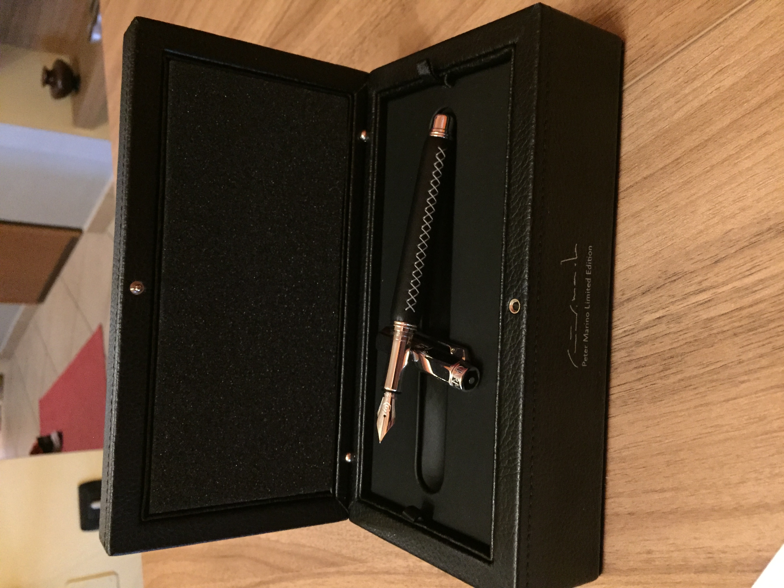 Ecco la mia ultima stilografica un bel regalo di compleanno Caran d’Ache Peter Marino LE Corpo rivestito di una bella pelle nera pennino in oro bianco EF non l’ho ancora inchiostrata per il momento caricamento con cartucceo con un ottimo converter È la mia prima penna “importante” molto particolare ...