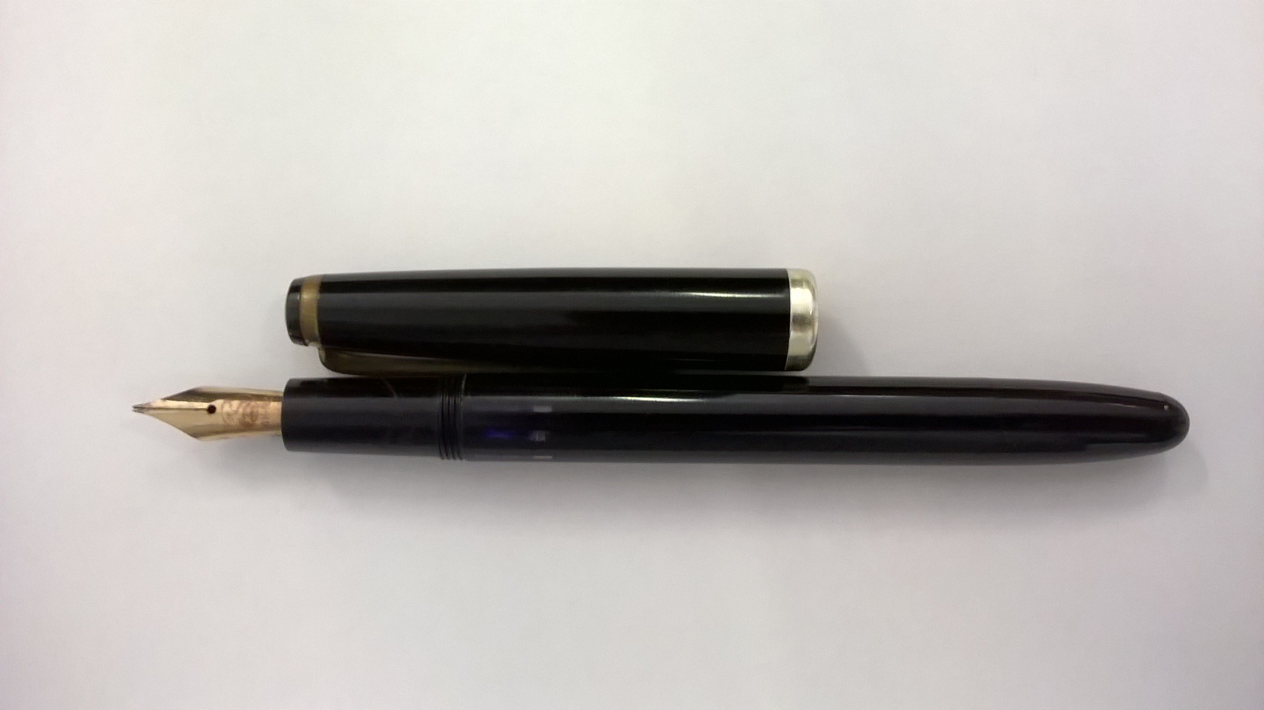 E' una vecchia stilografica a stantuffo in celluloide nera, non riporta nessuna scritta ne marchio, sul pennino è raffigurato lo stemma di uno stambecco che ho scoperto essere il logo dei pennini di Francesco Dellera.