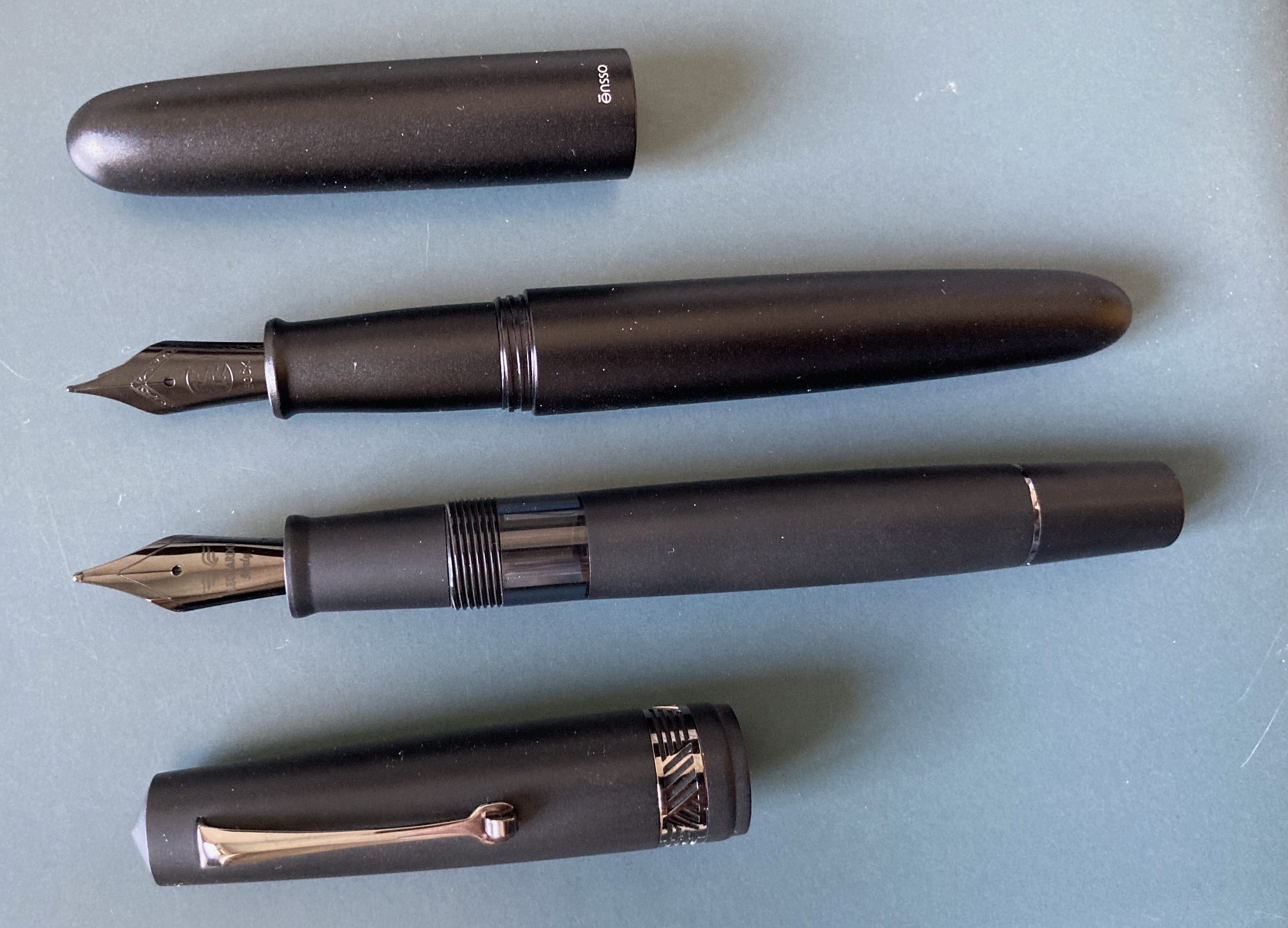 Oltre che del tutto infotografabile... Qui affiancata ad un'altra "all black" opaca un po' più ordinaria: In realtà se le guardo sul tavolo han lo stesso colore, ma la Momento Magico reagisce moltissimo alla luce mentre l'altra rimane "piatta", come imbalsamata nel suo nero. Stesso discorso per il pennino e questo è un grossissimo vantaggio perchè il pennino che sembra dipinto di nero opaco con lo smalto da ferramenta non l'ho mai amato mentre questo ha un po' di vita.