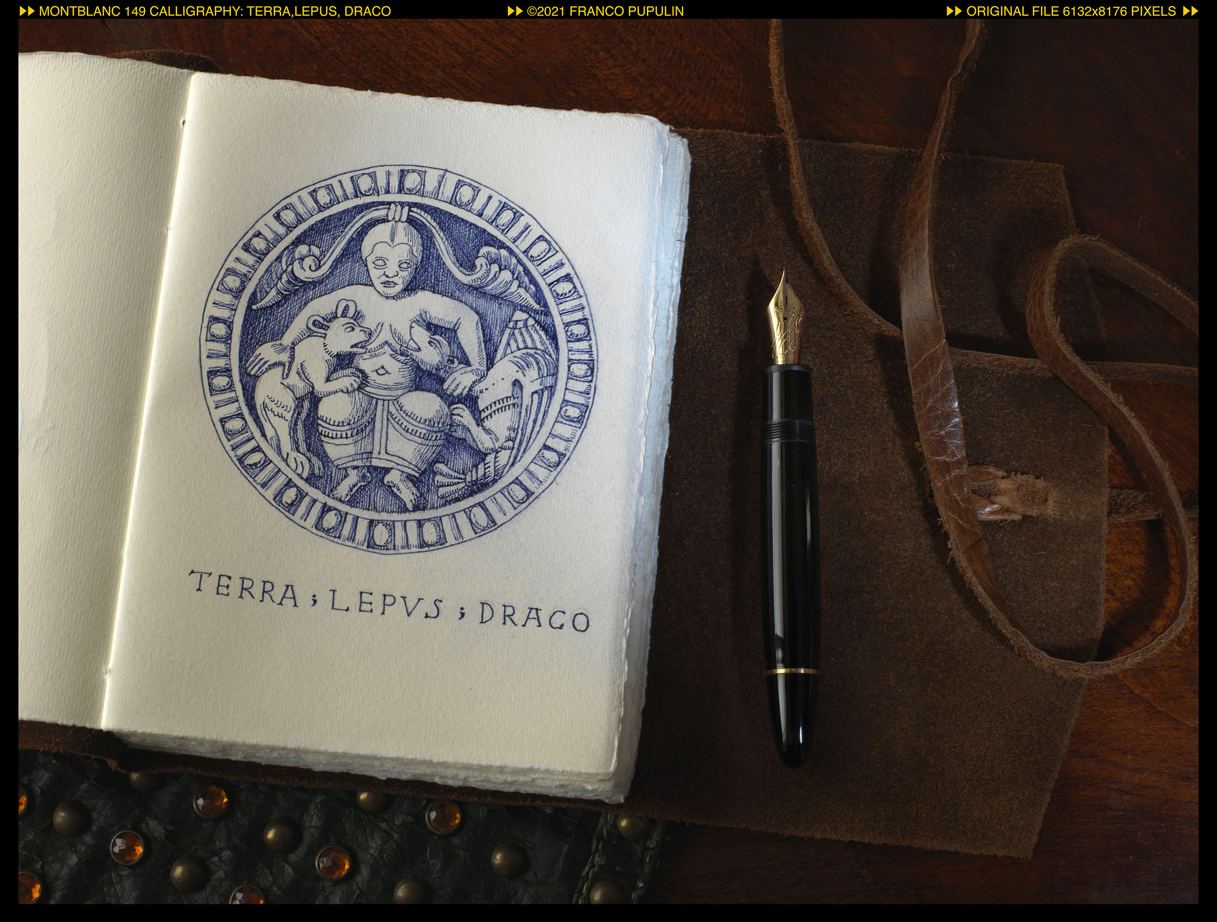 In particolare, mi ha incuriosito la raffigurazione su una delle quattro pedine, dove si vede una figura femminile accovacciata, nell'atto di allattare contemporaneamente una lepre sulla sinistra e un draghetto sulla destra. La scritta lungo il bordo della pedina conferma l'identificazione dei due "animali" e dà nome anche alla figura umana: "TERRA ; LEPUS ; DRACO”. Riproduco qui sotto il mio disegno del dritto della pedina, eseguito su materiali molto "medioevali". Il quaderno in pelle, regalo natalizio di mia moglie, si chiama infatti "Medioevo", e anche se Elvira lo acquistó in Germania, é prodotto in Italia da un'azienda che si chiama Manufactus. All'interno del quaderno si trovano quinterni di carta di Amalfi, una carta di cottone fatta a mano che inizió a prodursi nella regione amalfitana il XII e il XIII secolo: quasi contemporanaea alle pedine. L'inchiostro blu é il Permanent di Montblanc, e la penna é la mia fidata Meisterstück 149 Calligraphy, che sulla carta di Amalfi é ottima anche per disegnare.