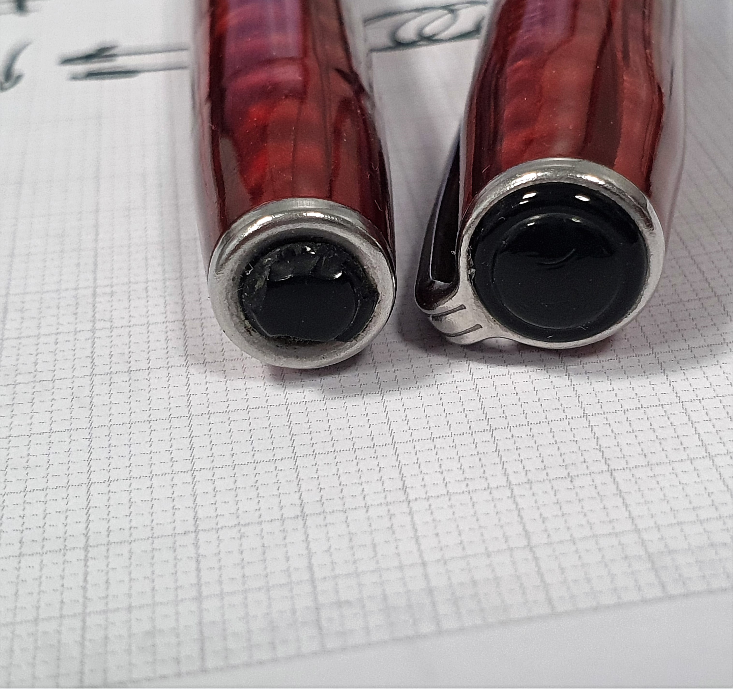 La cosa che mi ha fatto sorridere sin dall’inizio è stata questa altisonante dicitura “double jewel” che poi al lato pratico altro non sono che due dischetti di plastica nera alle estremità. Purtroppo, nella penna in mio possesso, uno è lievemente danneggiato.