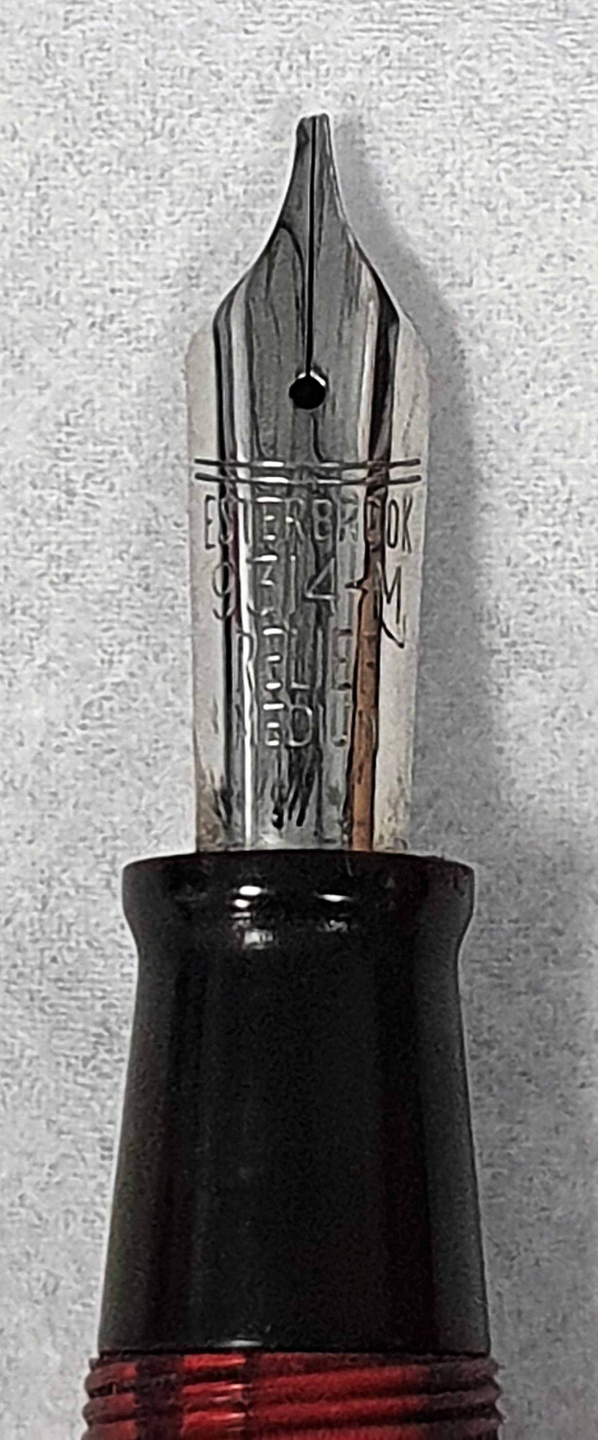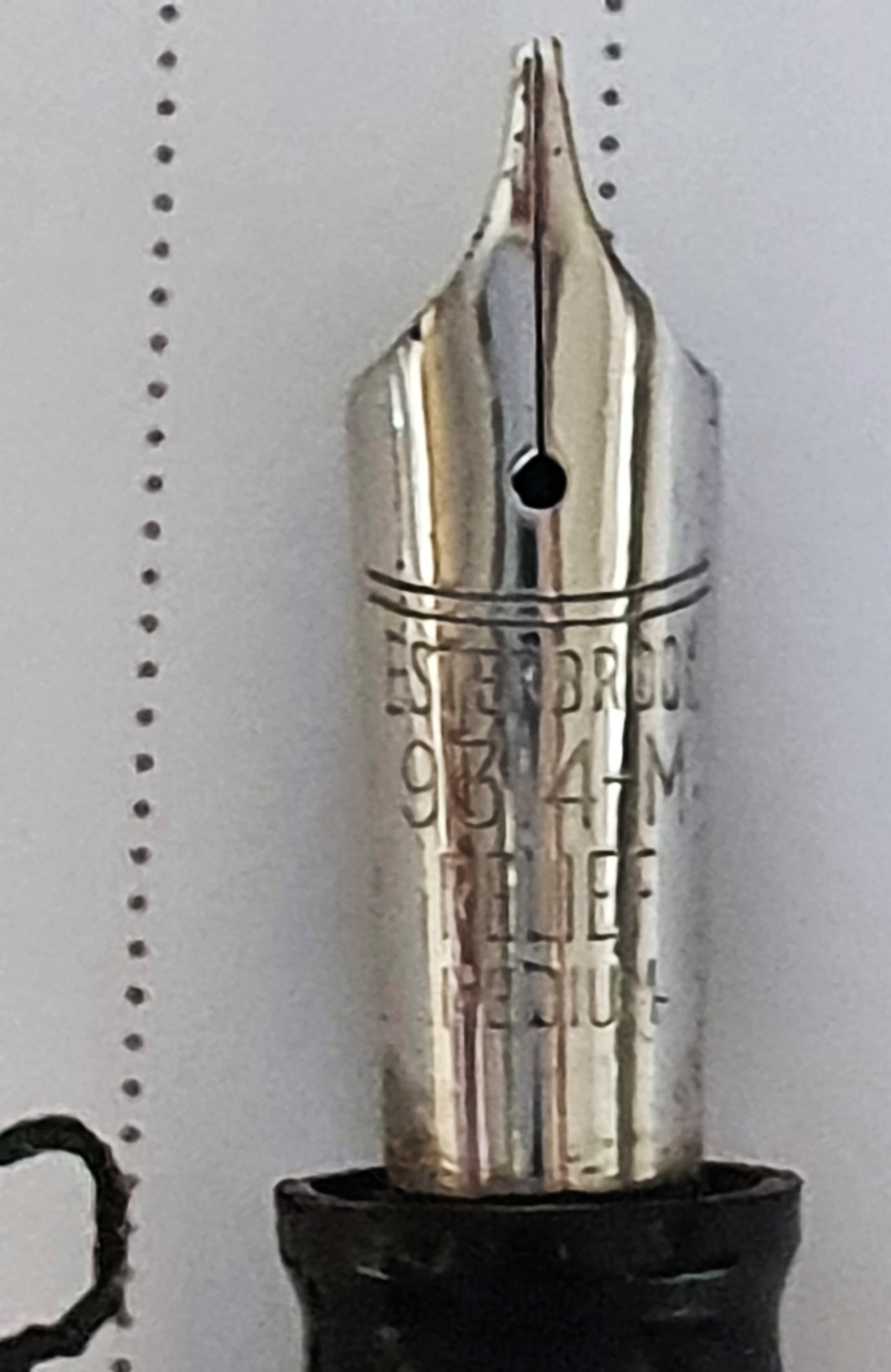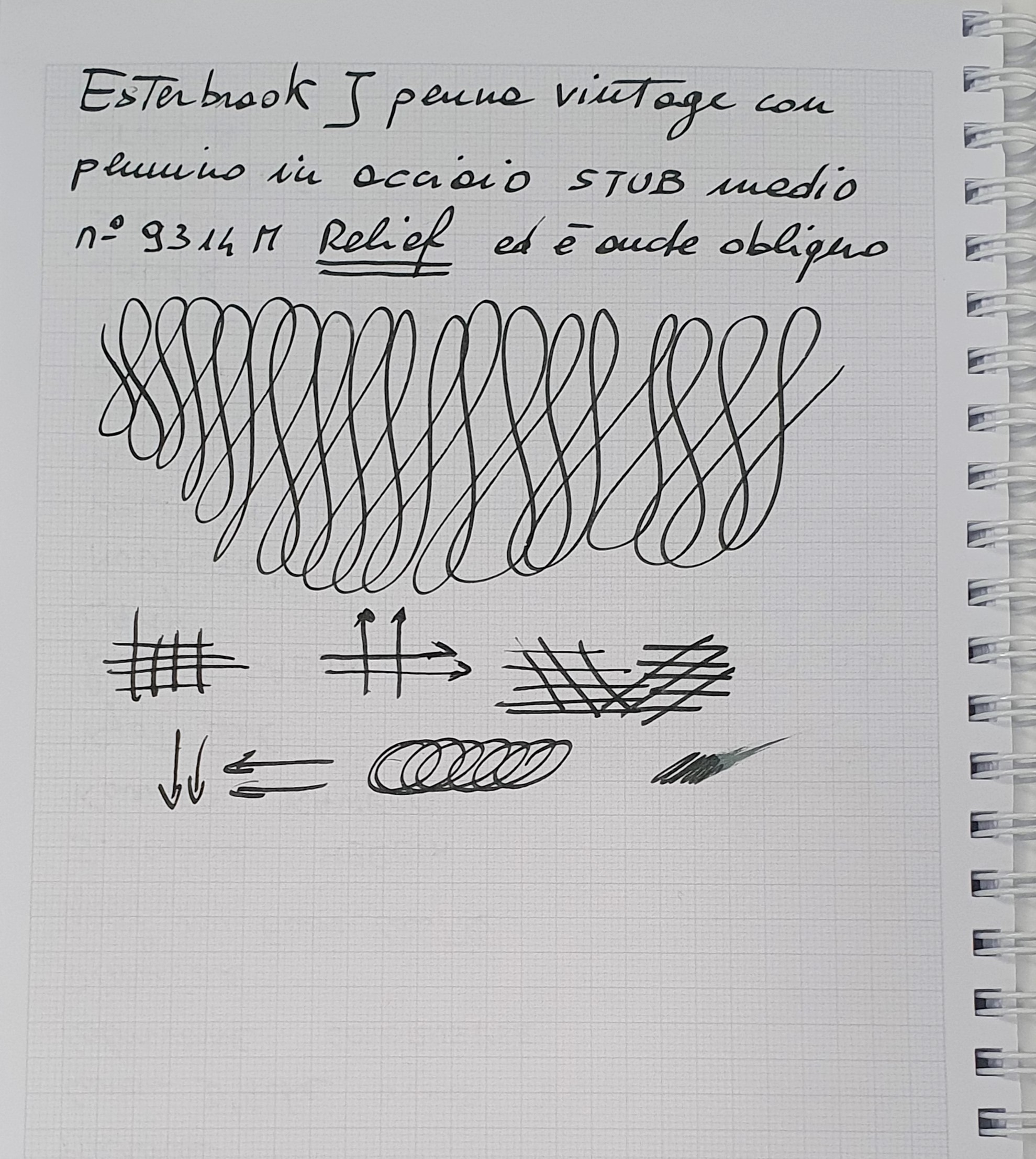 La mia J è dotata di un pennino in acciaio che reca la dicitura “9314-M Relief Medium”. Cercando in rete (qui un esempio http://www.snyderfamily.com/current/estienibs.htm) ho visto che Esterbrook ha realizzato negli anni molti tipi di pennino tutti in acciaio con caratteristiche differenti, indicatore questo del desiderio dell'azienda di costruire penne durevoli, per un utilizzo quotidiano e per soddisfare ogni esigenza. I principali pennini che si possono trovare sono quelli della serie 1000 e 2000 chiamati DuraCrome Point con punte in acciaio ripiegato, serie 3000 (Osmoridium) più durevoli e scorrevoli e poi quelli della serie 9000 “Master Point” con la punta in Iridio. Tutti i pennini sono tra loro compatibili e possono essere facilmente sostituiti semplicemente svitandoli, tipo Pelikan. Quello della mia J è 9314-M uno STUB medio (direi circa 1.0) con la punta obliqua in iridio.
