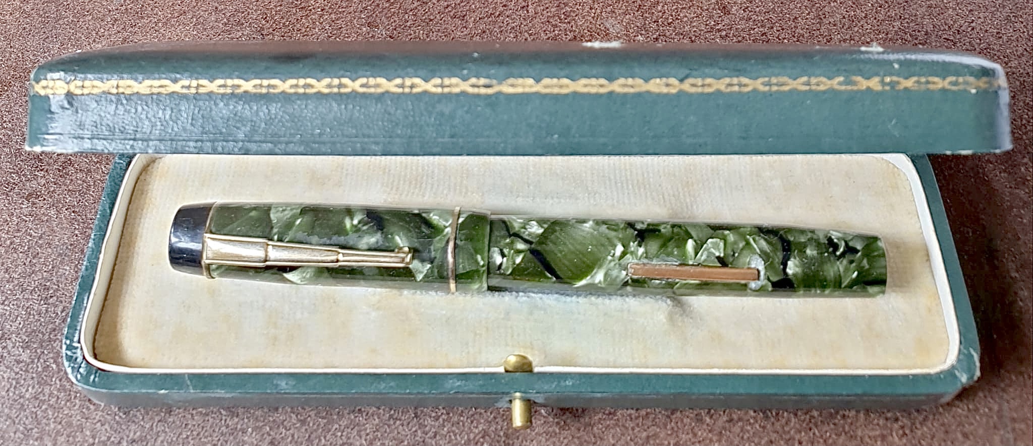 “Richard-Morges. Made in England”, stilografica in celluloide, caricamento a levetta, pennino 14 C con il caratteristico unicorno e la scritta “osmiridium”. Penna commercializzata negli anni ‘40 dalla ditta “Richard” di Morges (Svizzera) che commissionava le sue penne alla "Unique Pen Co., LTD.” di Londra.