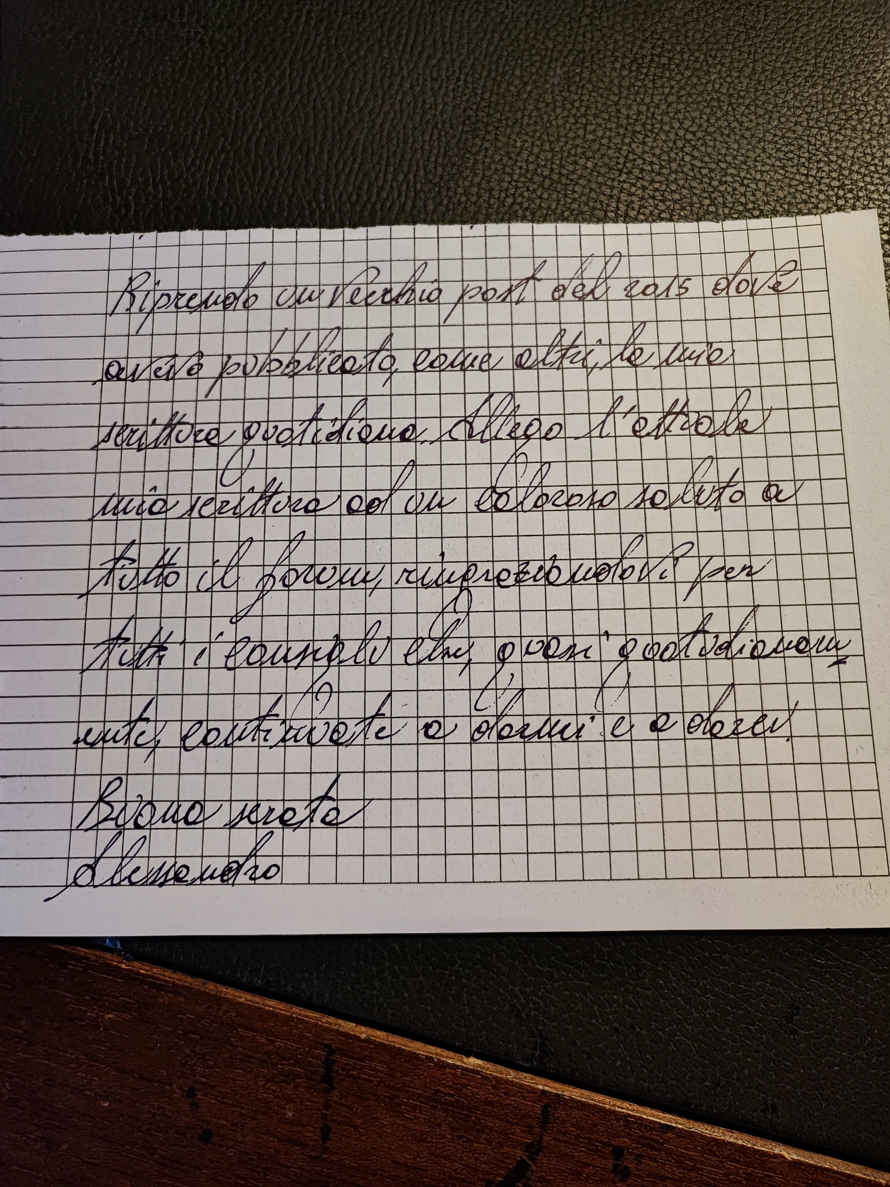Ho cambiato molto controllando sia l'inclinazione del foglio che il modo in cui tengo la penna. Credo che per migliorare ancora devo trovare qualcosa come se fosse un corsivo diverso e imparare da 0 quest'ultimo.