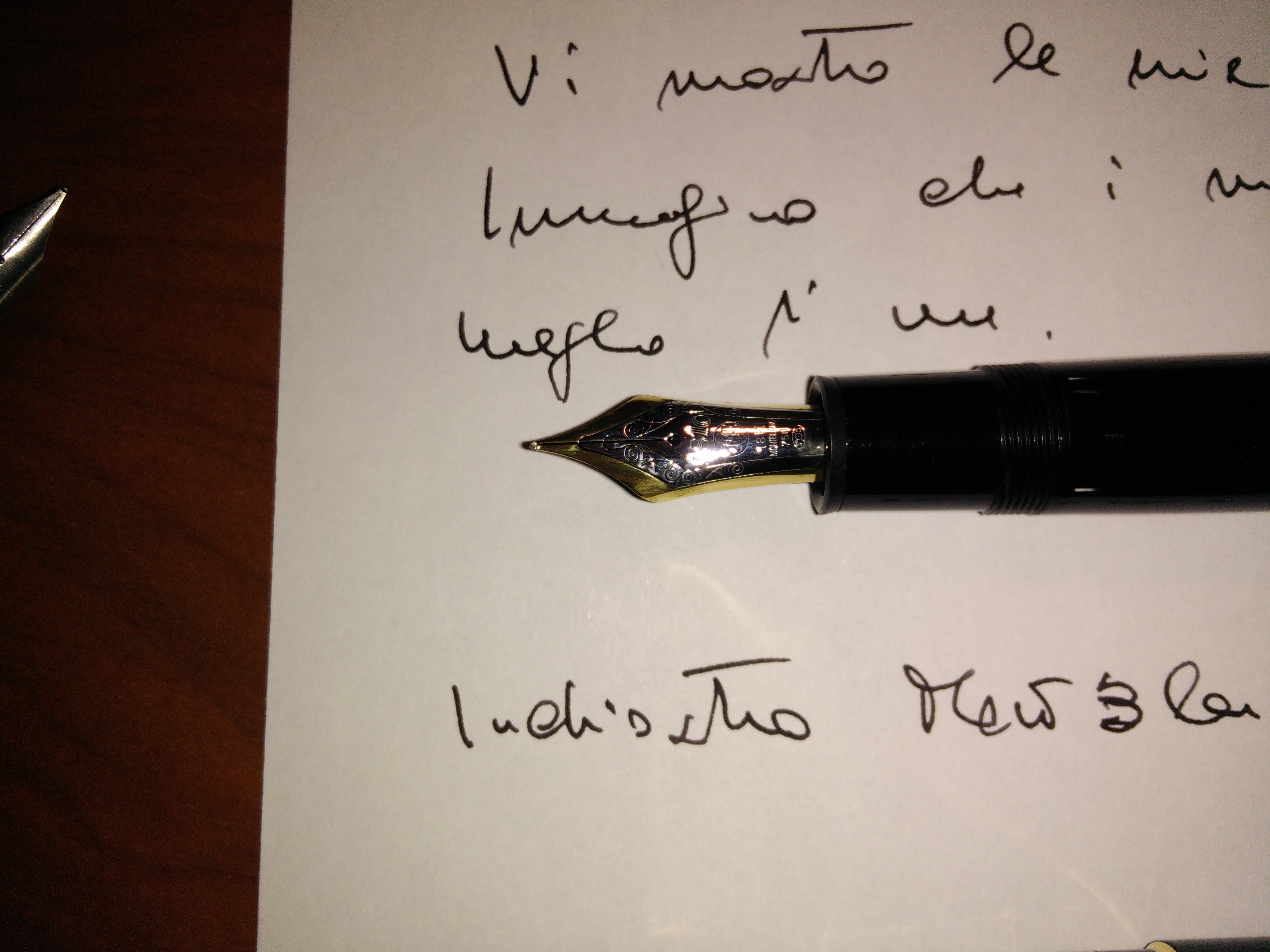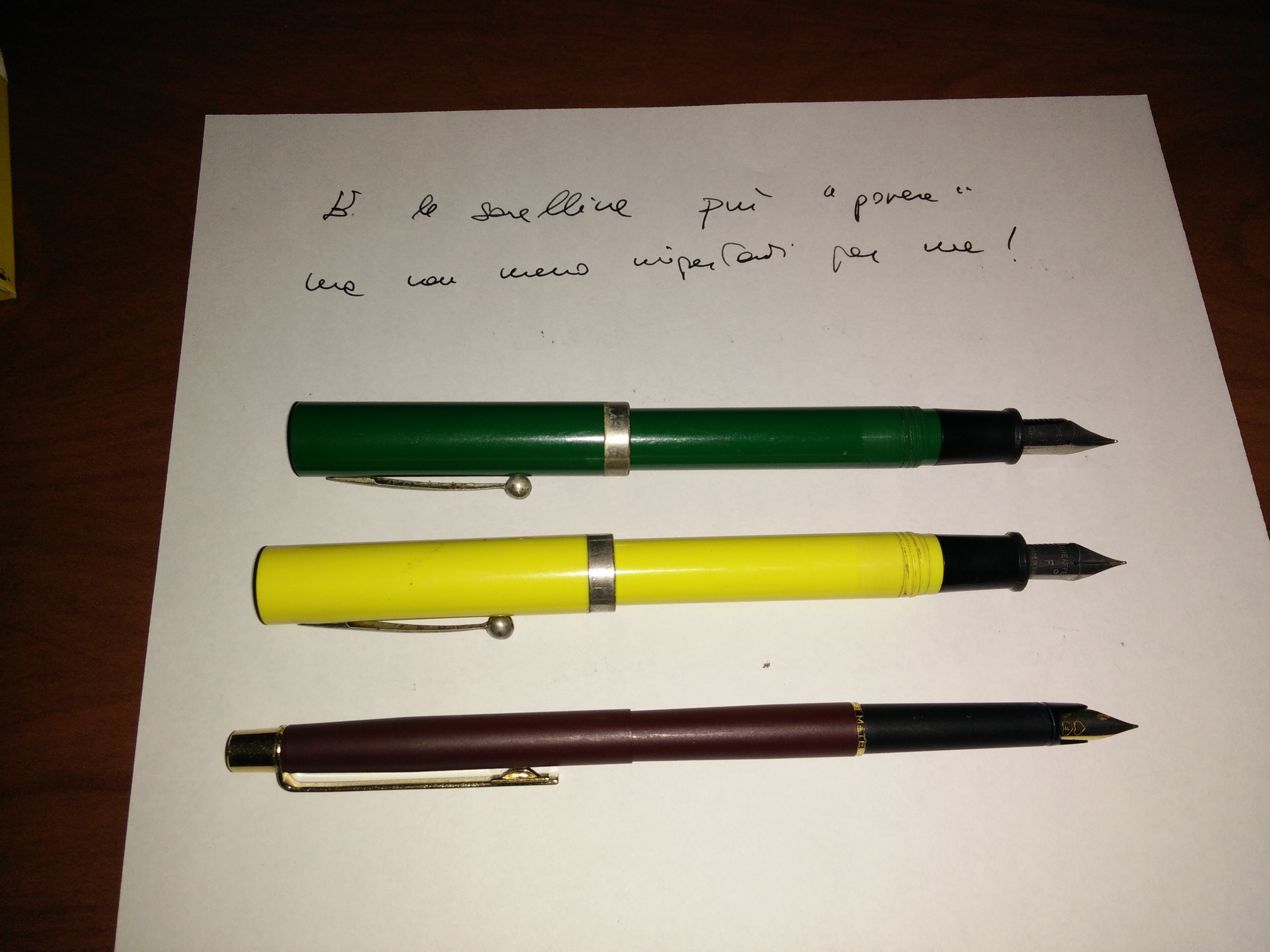 Avevo una Faber-Castell (non ricordo il modello) con pennino M che usavo solo con le cartucce e da poco ho comprato tre Lamy Logo con i tre pennini calligrafici cui ho aggiunto l'EF. Al momento i miei preferiti sono proprio quest'ultimo e l'1.1. Avevo un converter per la Faber-Castell mai utilizzato ma ora rimedierò presto visto che ne ho presi altri due per le Lamy più sei inchiostri Diamine nuovi fiammanti! Eh eh eh
