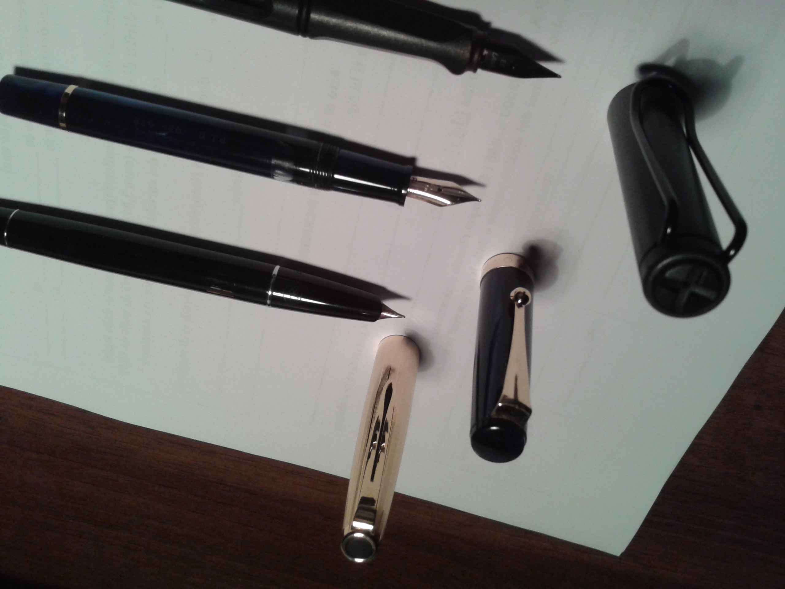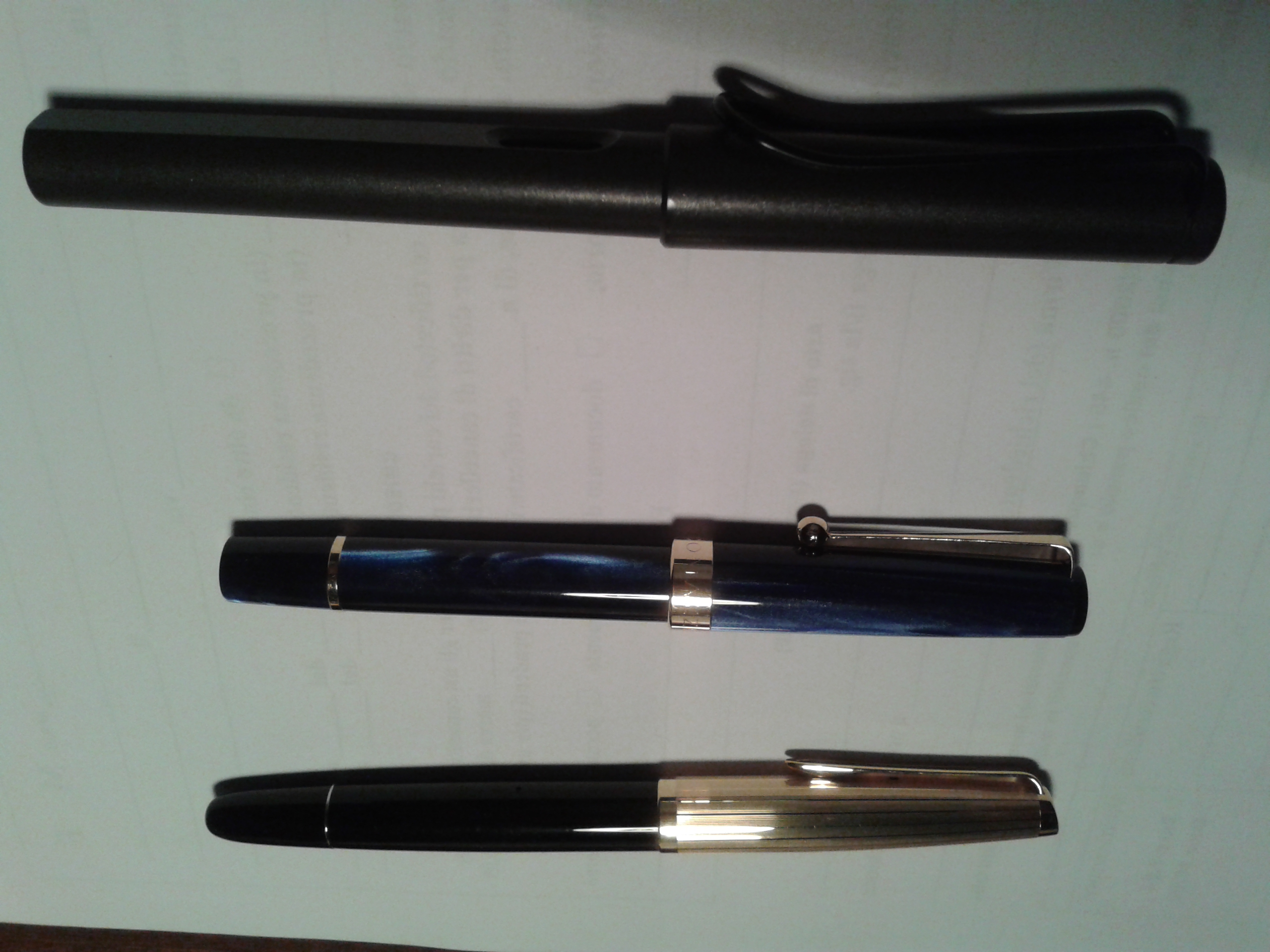 La seconda è una Giacomazzi PLG 93 con pennino extra fine a 18k. Assomiglia molto ad una delle mie Pelikan 400, quanto a sensazione d'uso, per così dire. Pennino decisamente flessibile. Ha un unico difetto: la vite del sistema di caricamento risulta maledettamente dura, almeno all'inizio. La terza una economica ma fantastica Lamy Safari con pennino EF.