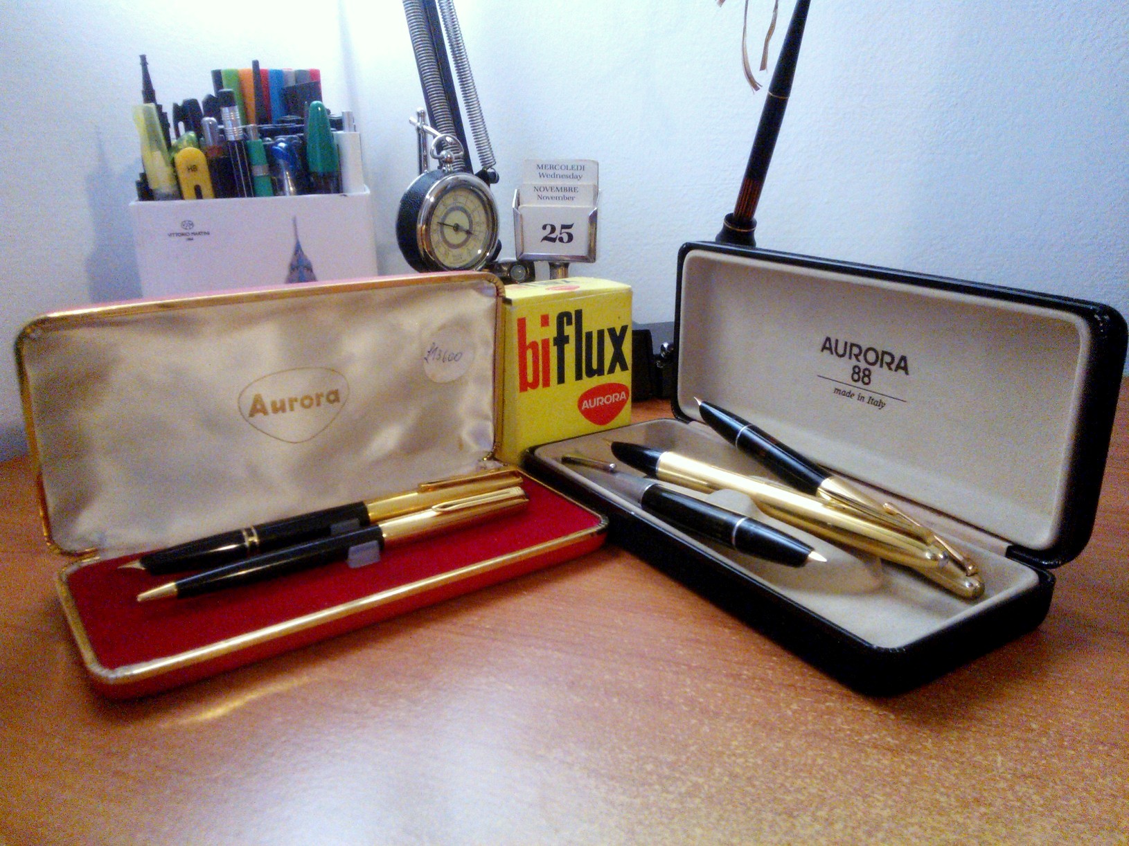 La prima è una Aurora 88p di cui vado particolarmente fiero. È stata un vero tesoro nascosto: l'ho disseppellita da un cassetto, con tanto di astuccio originale. Mai inchiostrata, è come si può vedere: pari al nuovo.