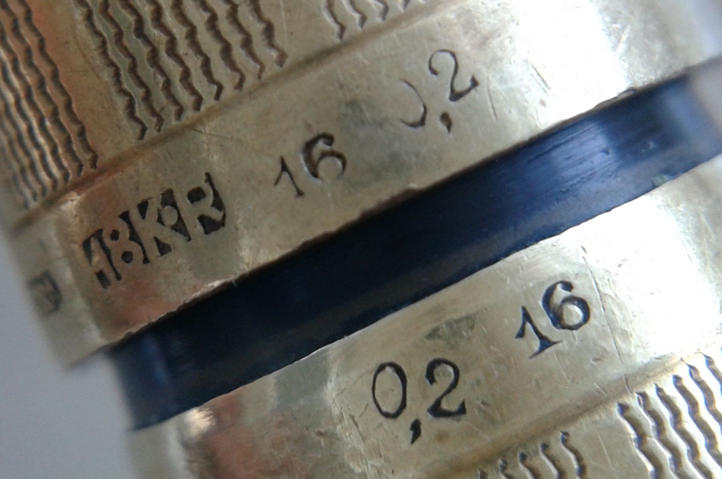Dovremo (solo per il momento, perchè non è troppo difficile trovarlo) rinunciare a mostrare l'iscrizione del pennino originale, mancante. Secondo il nostro Wiki deve essere punzonato oro 14k, avere foro di areazione circolare, essere marchiato con il logo ovoidale dell'azienda contenente la scritta "Aurora Torino" ed il numero relativo alla misura: nel caso di una RA2 dovrebbe ovviamente essere il #2, ma anche il # 2 e 1/2 è a volte presente (terzo aiuto! ;) )