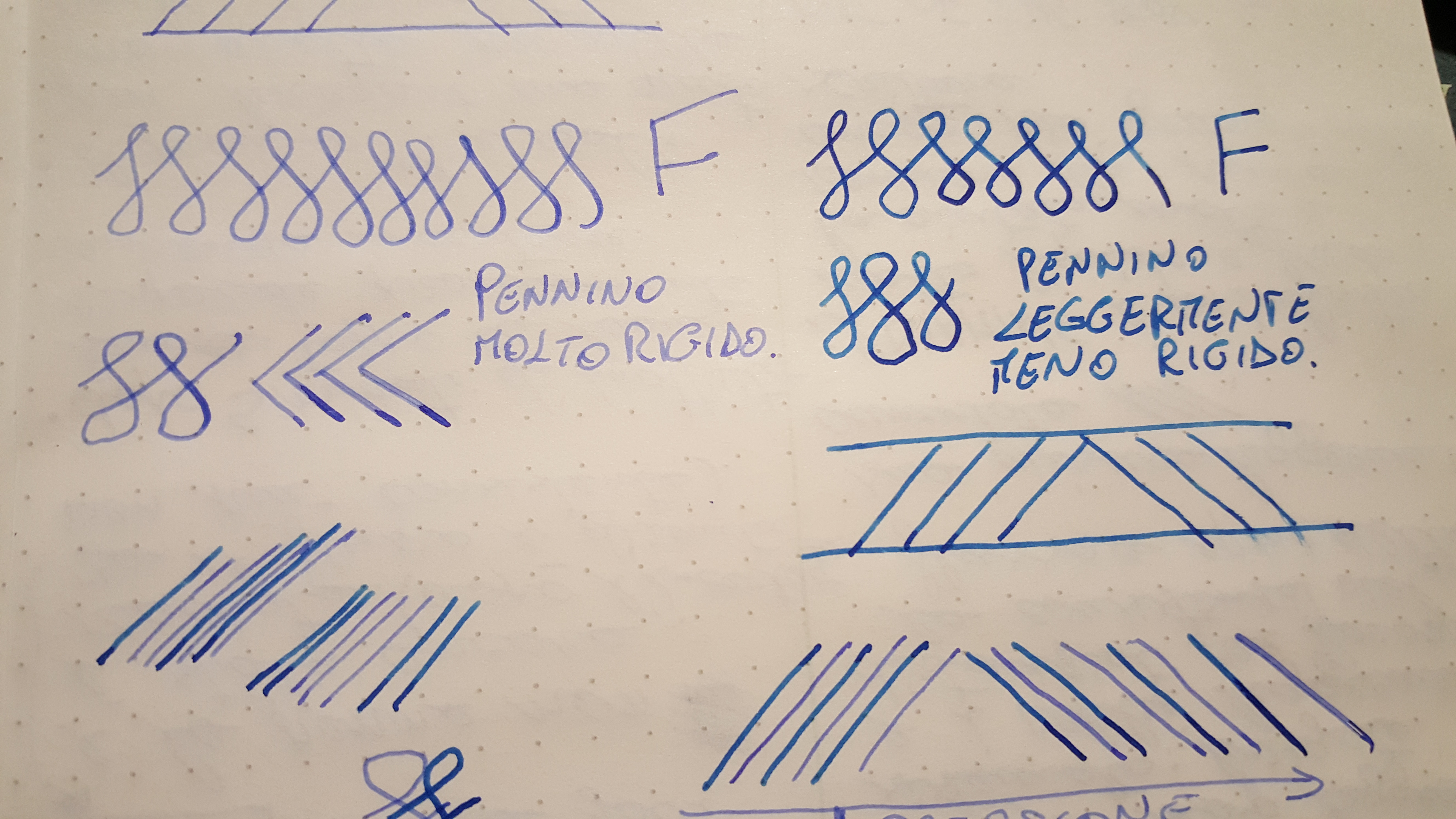 Devo dire che il gradino presente esattamente dove si mettono le dita (perdonate la mia ignoranza dei termini corretti) la rende non piacevolissima da usare ed anche il pennino duretto non depone a suo favore, per il resto scrive con tratto medio (anche se marcato F) e con flusso regolare senza impuntamenti e senza grattare.