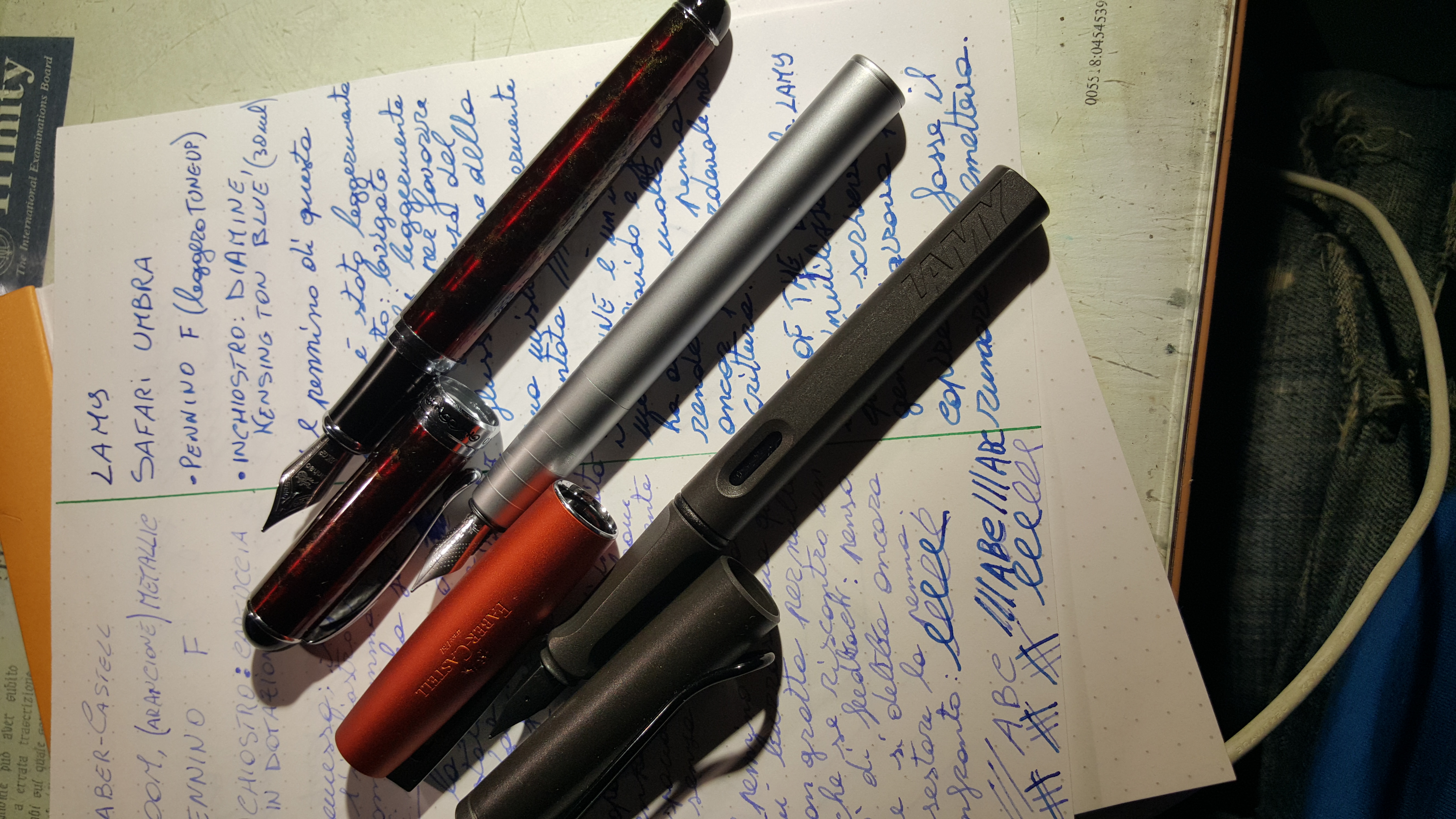 Le due penne ( Lamy safari, e Faber-Castell Loom) son a mio dire due ottime entry level, la Lamy per chi preferisce leggerezza, la seconda in metallo e alluminio per chi preferisce più consistenza e nessun vincolo di impugnatura.