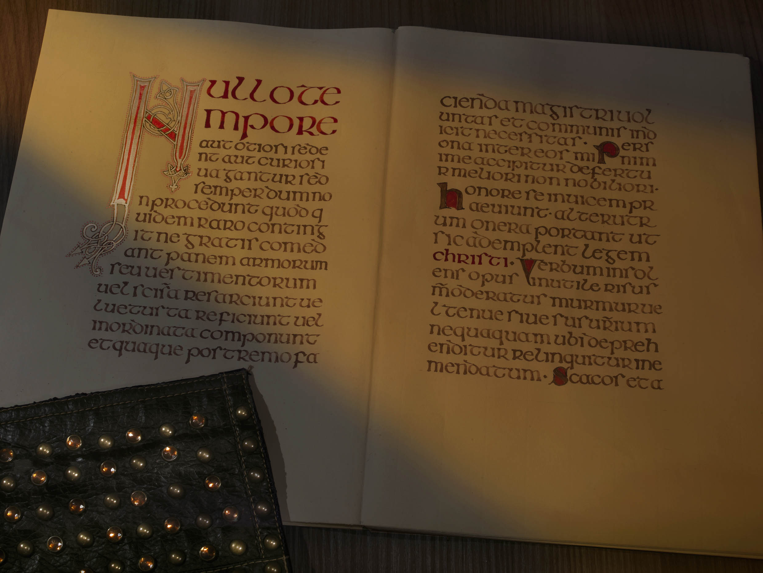 La scrittura semionciale insulare che ho utilizzato é un po’ “antica” per il testo, poiché la massima fioritura di questa grafia si colloca tra il VII e il IX secolo, quasi 300 anni prima che Bernard de Clairvaux scrivesse la sua opera.