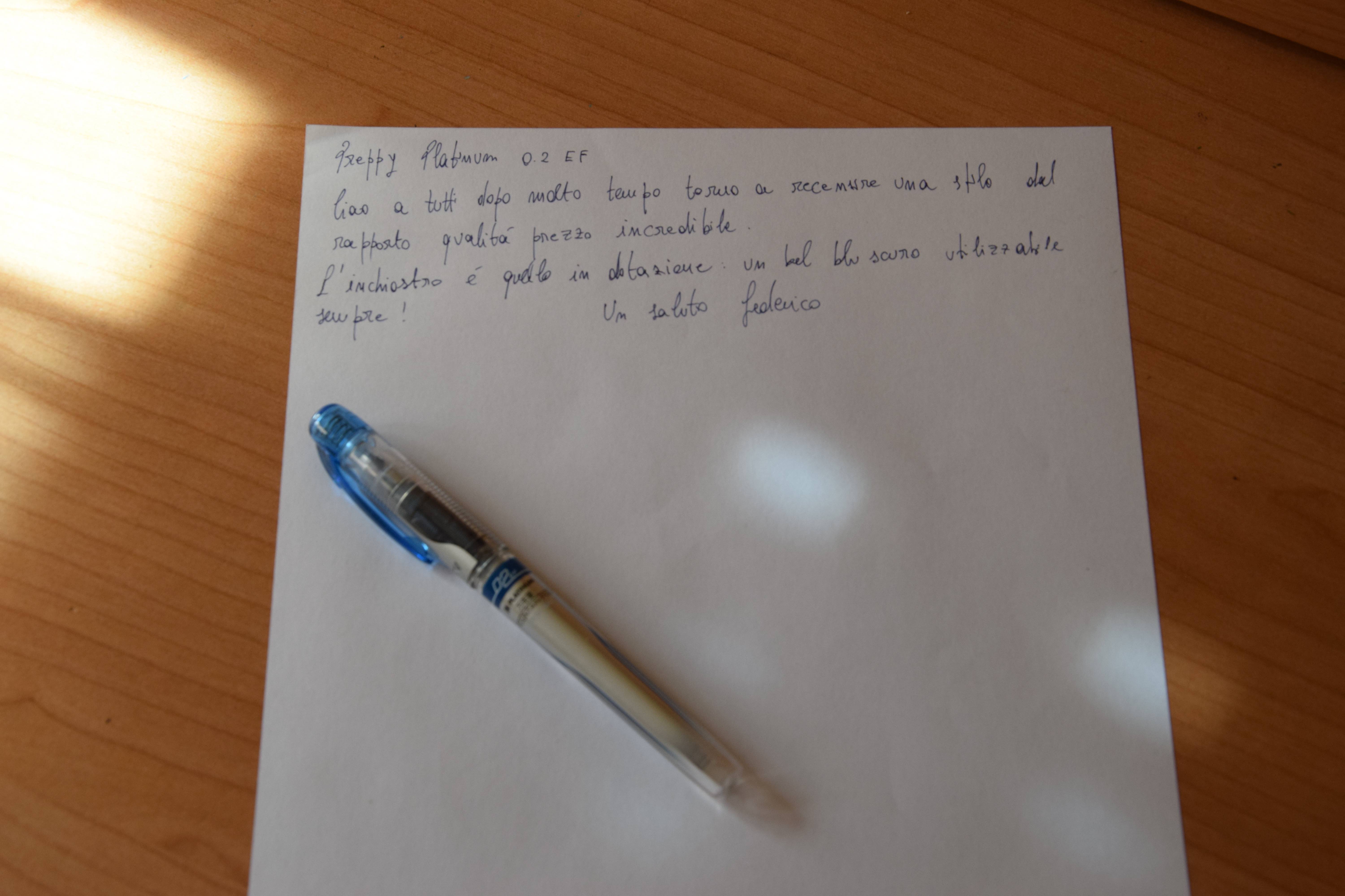 Come tratto ho scelto l'extra fine perché mi piacciono particolarmente i tratti F ed EF ma quest'ultimo non lo avevo mai provato pertanto, attirato dal prezzo basso e dai pareri positivi, mi sono deciso a prenderla in questo modo. Le recensioni che avevo letto sono state confermate senza batter ciglio: il tratto è molto fine ed il pennino non ha praticamente mai incertezze ma, soprattutto, non risulta un chiodo non restituendo mai vibrazioni poco piacevoli durante la scrittura. L'unica nota negativa è determinata dal fatto che se non viene usata per del tempo anche chiusa quando viene ripresa non scrive immediatamente dovendo perderci qualche secondo per farla sbloccare: questo potrebbe derivare anche da un inchiostro troppo viscoso ma, non appena finirà, la caricherò con un Diamine notoriamente poco viscosi. Questo problemino a mio parere non rovina assolutamente l'esperienza di scrittura presentandosi solo all'inizio ;)
