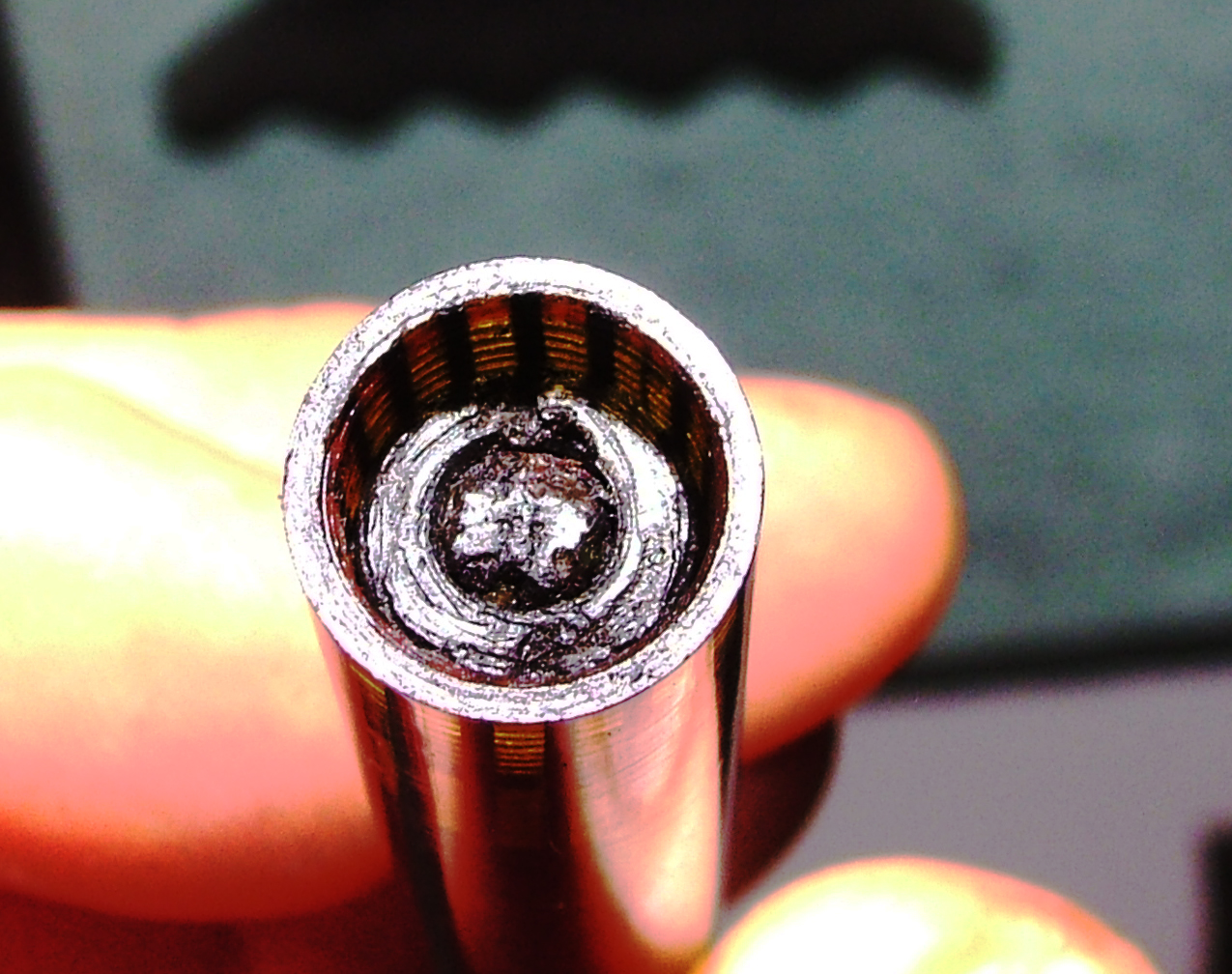 Sì, è un difetto frequente. Il forellino serve a sfogare la pressione che si genera dietro lo stantuffo quando lo stesso sale e la depressione che allo stesso modo si genera quando scende: se esce inchiostro (od acqua sporca d'inchiostro) significa una cosa sola: la tenuta dello stantuffo non è perfetta, cosa frequentissima nelle penne ferme da tempo. A meno che il caricamento non sia stato azionato con la penna totalmente immersa in acqua. Molto spesso è sufficiente smontare le guarnizioni che costituiscono il pistone, separarle e lavarle accuratamente e rimontarle dopo averle lubrificate leggermente con grasso siliconico o vasellina. Attenzione però perché la plastica dello stantuffo spesso si è alterata col tempo diventando molto fragile. Molta attenzione nello svitare il dado circolare che blocca gli anelli di tenuta.