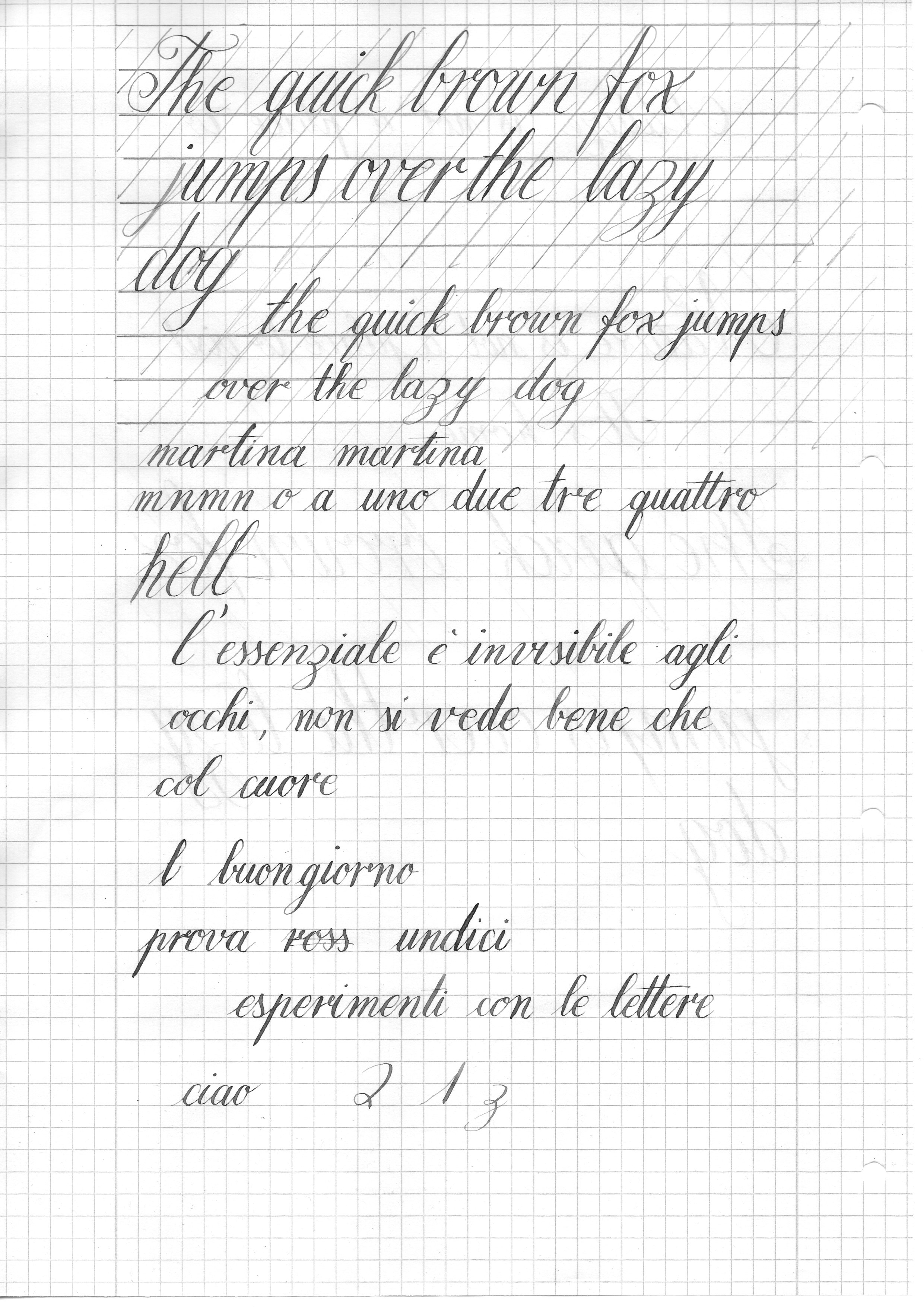 I quadretti non mi creano molta confusione, ma in ogni caso mantenere l'inclinazione costante delle lettere mi riesce difficile, infatti credo che si noti dall'esempio sopra postato. Ce n'è di strada da fare ;)
