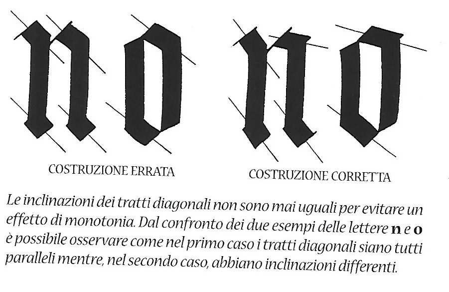 La parte successiva è dedicata all'esercizio vero e proprio, pertanto l’autrice presenta le varie lettere illustrando i diversi passaggi per la loro corretta costruzione e lasciando lo spazio per esercitarsi direttamente sul quaderno. Nello spazio dedicato agli esercizi, all'inizio di ogni riga dedicata alla lettera da studiare, vi è una rappresentazione grafica del pennino posto alla giusta inclinazione, rappresentata anch'essa con il disegno dell'angolo e della sua ampiezza, per capirci meglio vi lascio qui sotto una pagina tratta dal libro di calligrafia medievale. Io, per non rovinare i libri, ho preferito fotocopiare le pagine degli esercizi.