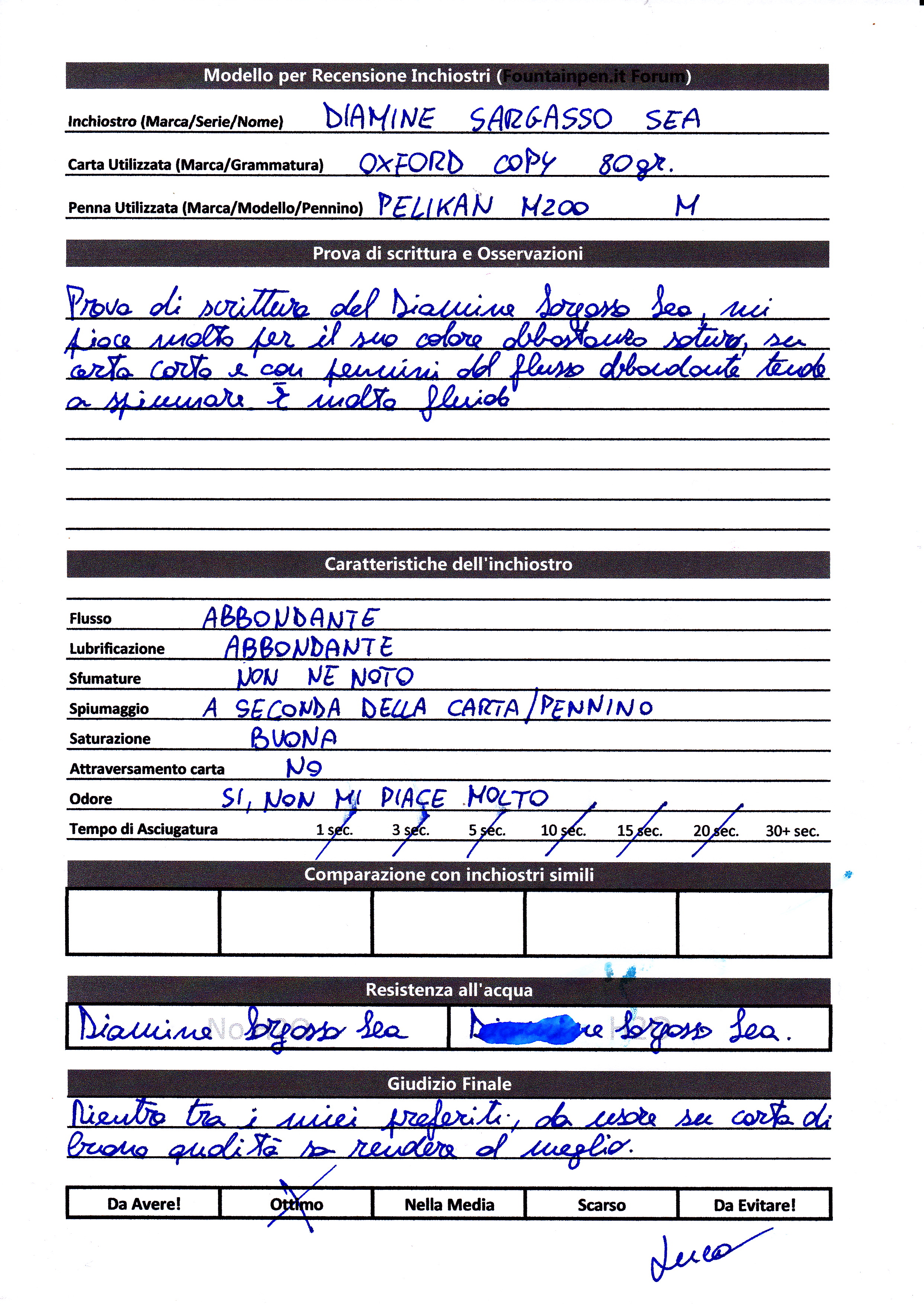 Bella recensione. Ho questo inchiostro, mi piace il colore ma non lo uso perché quando lo provai con una pelikan dal flusso abbondante e con una carta da tutti i giorni spiumava molto e passava anche dall' altra parte. Adesso che ho qualche blocco di buona qualità lo riproverò.