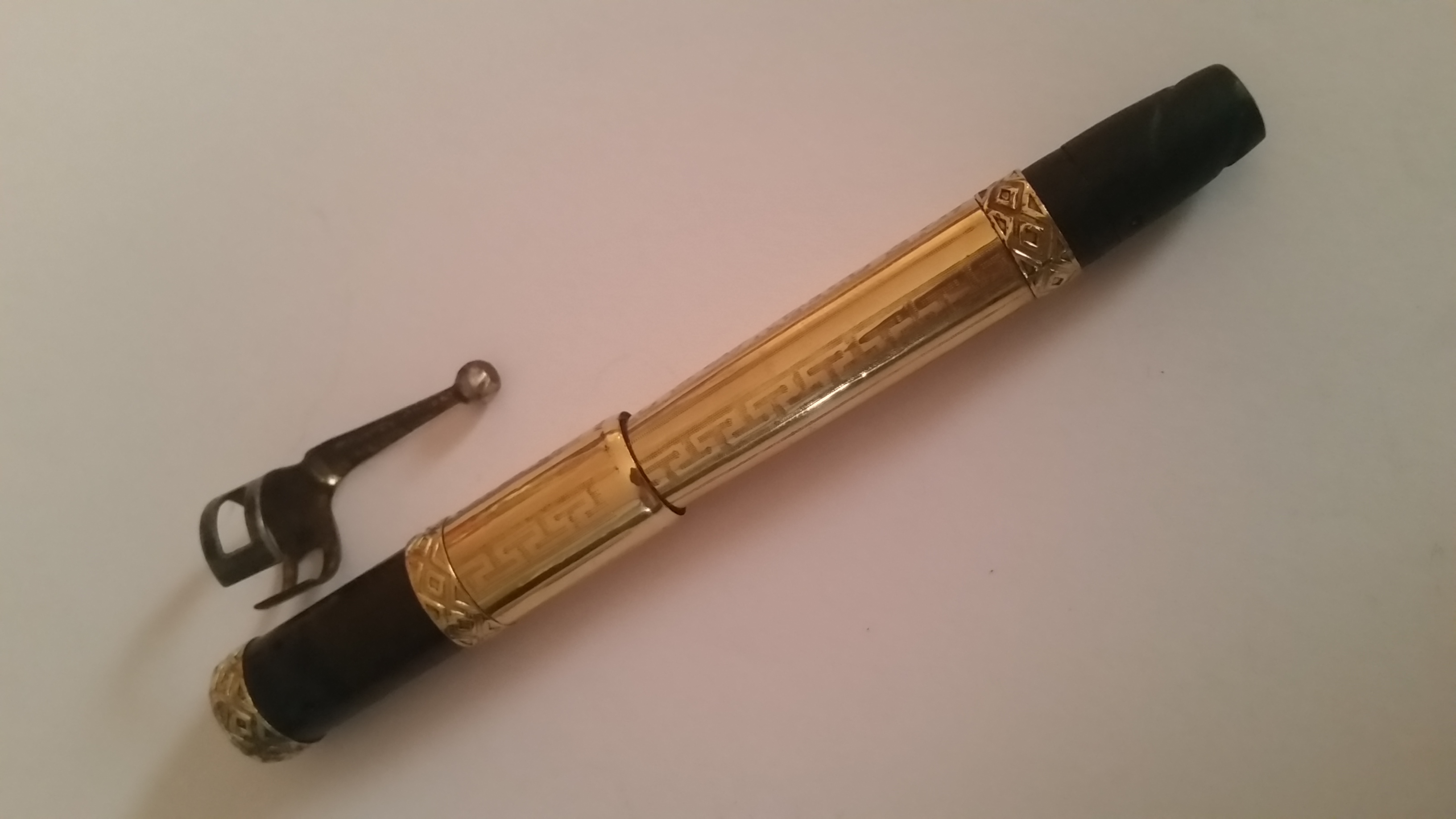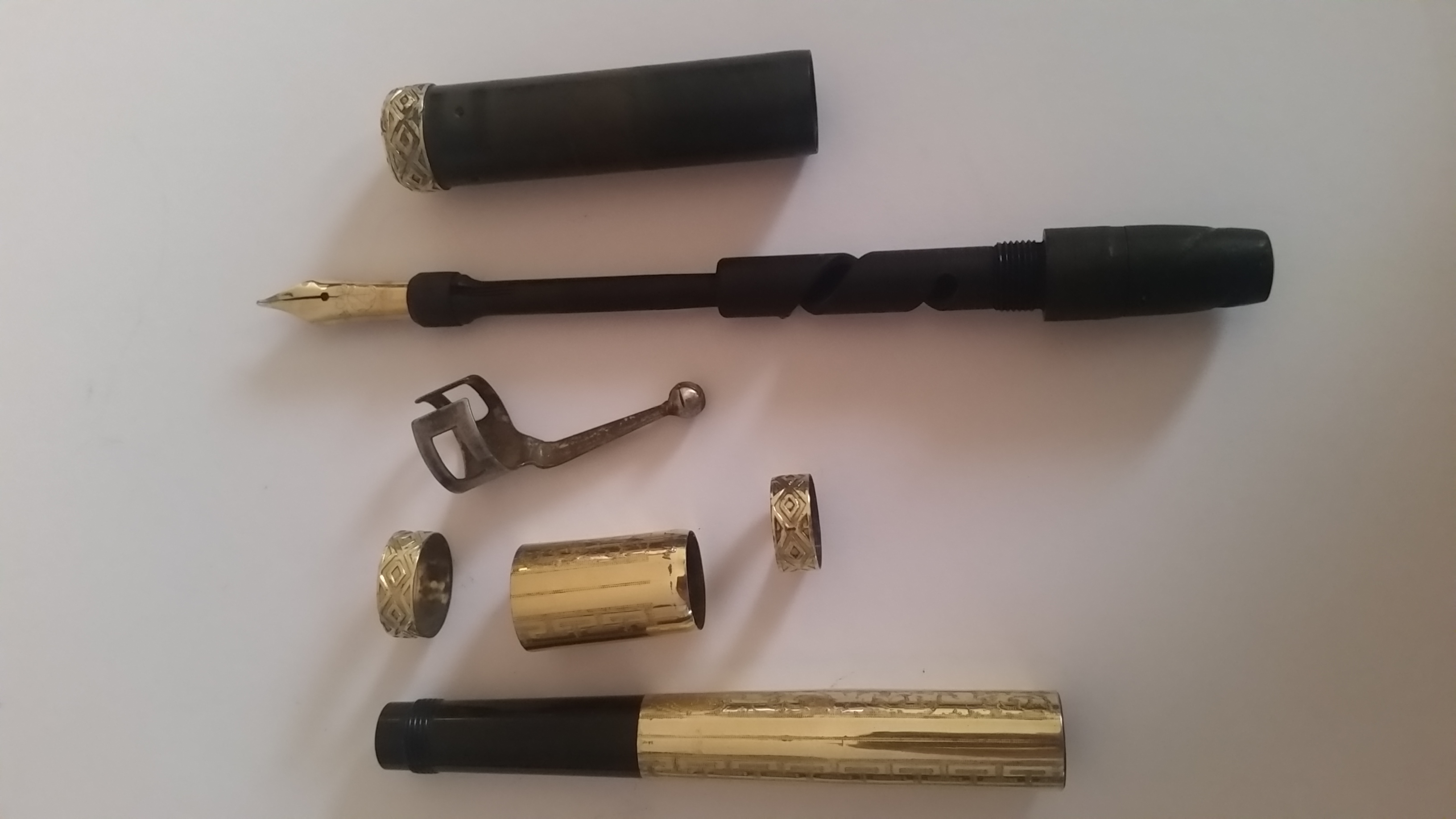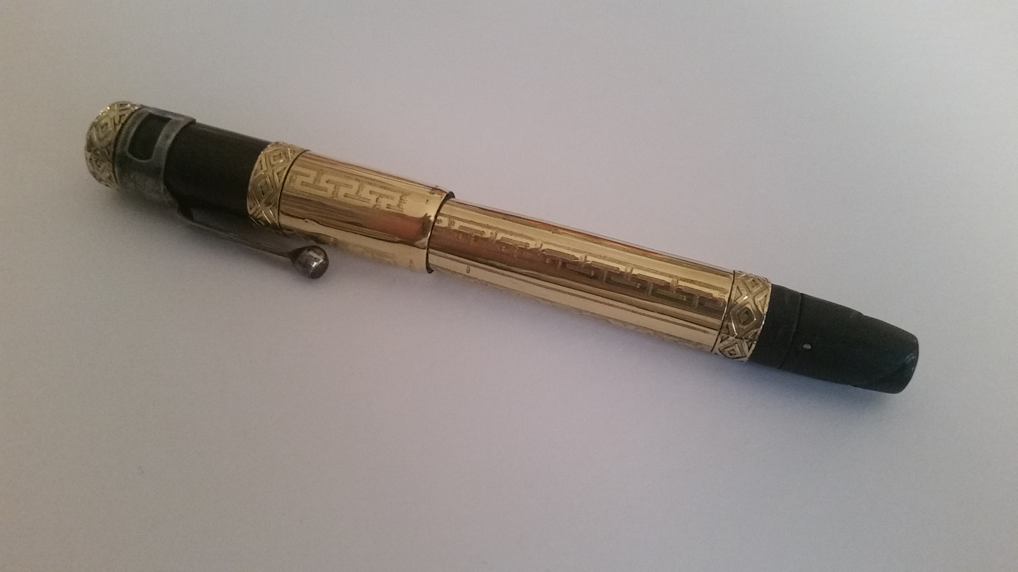 Oggi vi voglio presentare una delle ultime arrivate, ancora bisognosa di cure, ma con un fascino incredibile! Comprata al mercatino dell'usato di San Donato Milanese per 4 euro, questa penna era ricoperta da una sostanza bianca cristallizzata (immagino una muffa) che, insieme alla ruggine, ne aveva nascosto ogni incisione. Il pennino era bloccato e non potevo riconoscere né la marca né il materiale della penna. Presa per pura curiosità (vado matto per le rientranti), la portai a casa e cominciai a grattare via tutta la ruggine e quella sostanza cristallizzata, quando infine riportai alla luce le incisioni alla base del cappuccio e i miei occhi si illuminarono alla vista della scritta "MONT BLANC 18 KR."! Dopo aver rimosso tutta la sporcizia, la smontai rivelando il meraviglioso pennino numero 4 purtroppo gravemente danneggiato (una lunga crepa si fa strada tra le incisioni partendo dal foro di areazione fino al numero 4). Un altro problema consiste nell'assenza di una parte del rivestimento, diviso in parti. Penso che trovare la parte originale sia praticamente impossibile, ma volevo chiedere a voi se è possibile farla ricostruire da un orefice o magari ci sono altri modi. La clip era completamente ricoperta dalla ruggine e durante le operazioni di pulizia non ho potuto togliere la ruggine senza togliere la placcatura che vi era originariamente. Non so se la clip sia originale, ma all'interno di essa vi è inciso un numero 5. Mi ha sorpreso la parte superiore del cappuccio, decorata con un bellissimo fiore inciso, che ho già visto su altre montblanc rientranti. Il pennino è stato rimesso in linea dal gentilissimo Ugo al Pen Doctor Day, che mi ha informato che si trattava di un flessibile. Secondo voi è possibile ripararlo o è meglio sostituirlo? Il pennino era terribilmente piegato perché l'ago di sicurezza che impediva l'avvitamento del cappuccio con il pennino estratto è stato smarrito, e suppongo che la penna sia stata chiusa ancora con il pennino fuori, piegandolo malamente. Il fondello che permette di far uscire il pennino è solcato da due profondi segni a mo' di vite. Immagino che il fondello fosse anch'esso ricoperto da un rivestimento d'oro. Penso che anche qui ci sia bisogno di un pezzo originale (introvabile) o di un orefice. Questo è tutto ciò che so, e chiedo a voi esperti se riuscite a dare una possibile datazione e qualche informazione utile per il suo restauro (mi piacerebbe tantissimo riportarla al suo antico fascino! ). Vi metto di seguito alcune foto. Ringrazio tutti per l'attenzione e auguro ad ognuno di voi una buona serata!