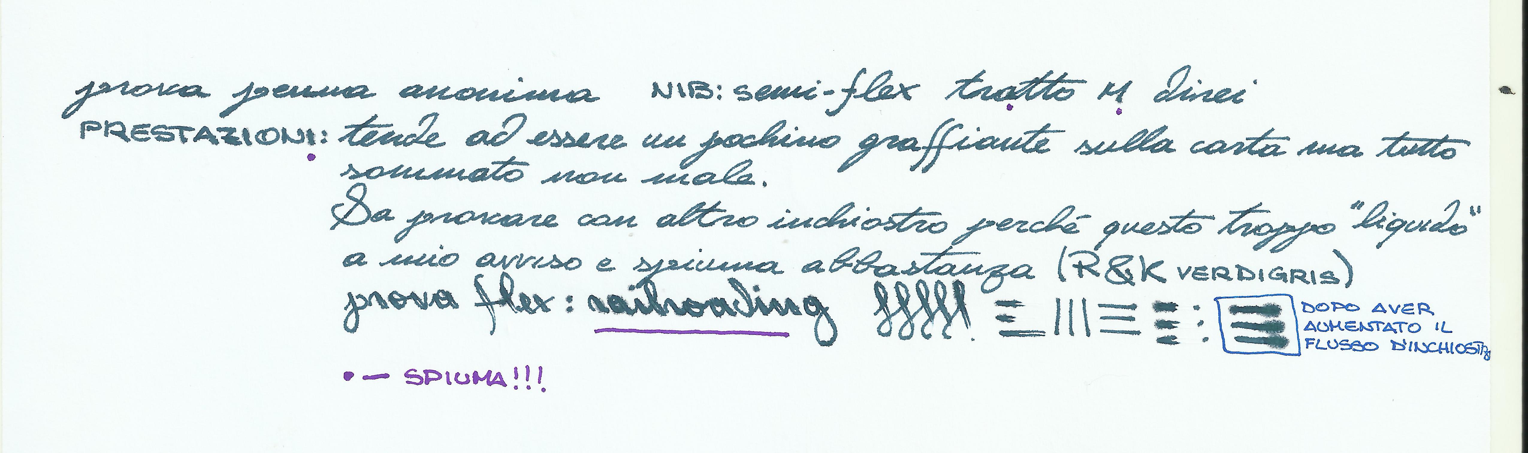 Non ci sono altre scritte nè sulla confezione nè sulla penna se non, nel pennino, l'incisione di alcune lettere: "rAn" si riesce a leggere ma altre sono nascoste dalla sezione della penna. Il pennino comunque direi essere più o meno flessibile, ma l'unico paragone che posso fare per ora su questa tipologia è una jinhao con Zebra G rispetto alla quale sembra flettersi in modo molto più morbido con analoga pressione.