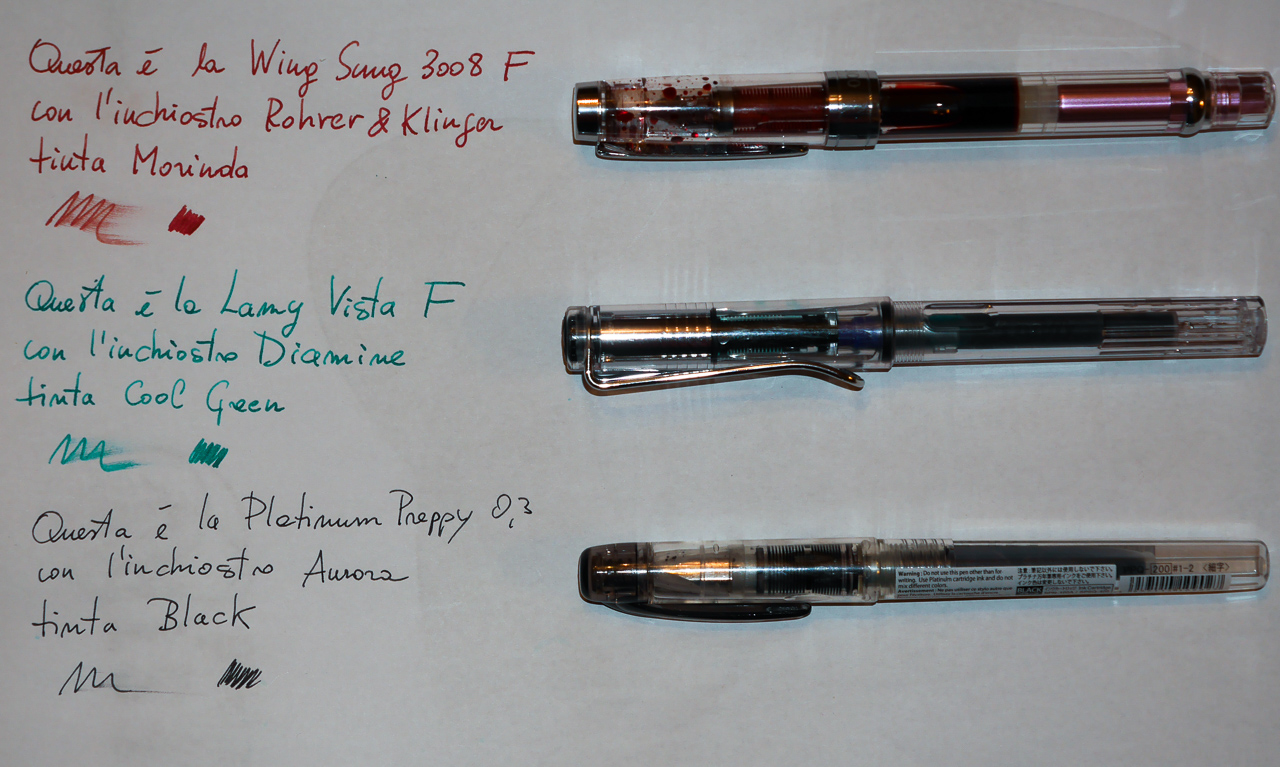 Il miglior inchiostro è per me l'Aurora Black, ma come colore il mio preferito è il Rohrer & Klinger Morinda, ha una bellissima tinta bordeaux e può essere usato sia per scrivere che per correggere come rosso (un po' scuro, ma non eccessivamente). Mi piace molto anche il blu lavabile Lamy.