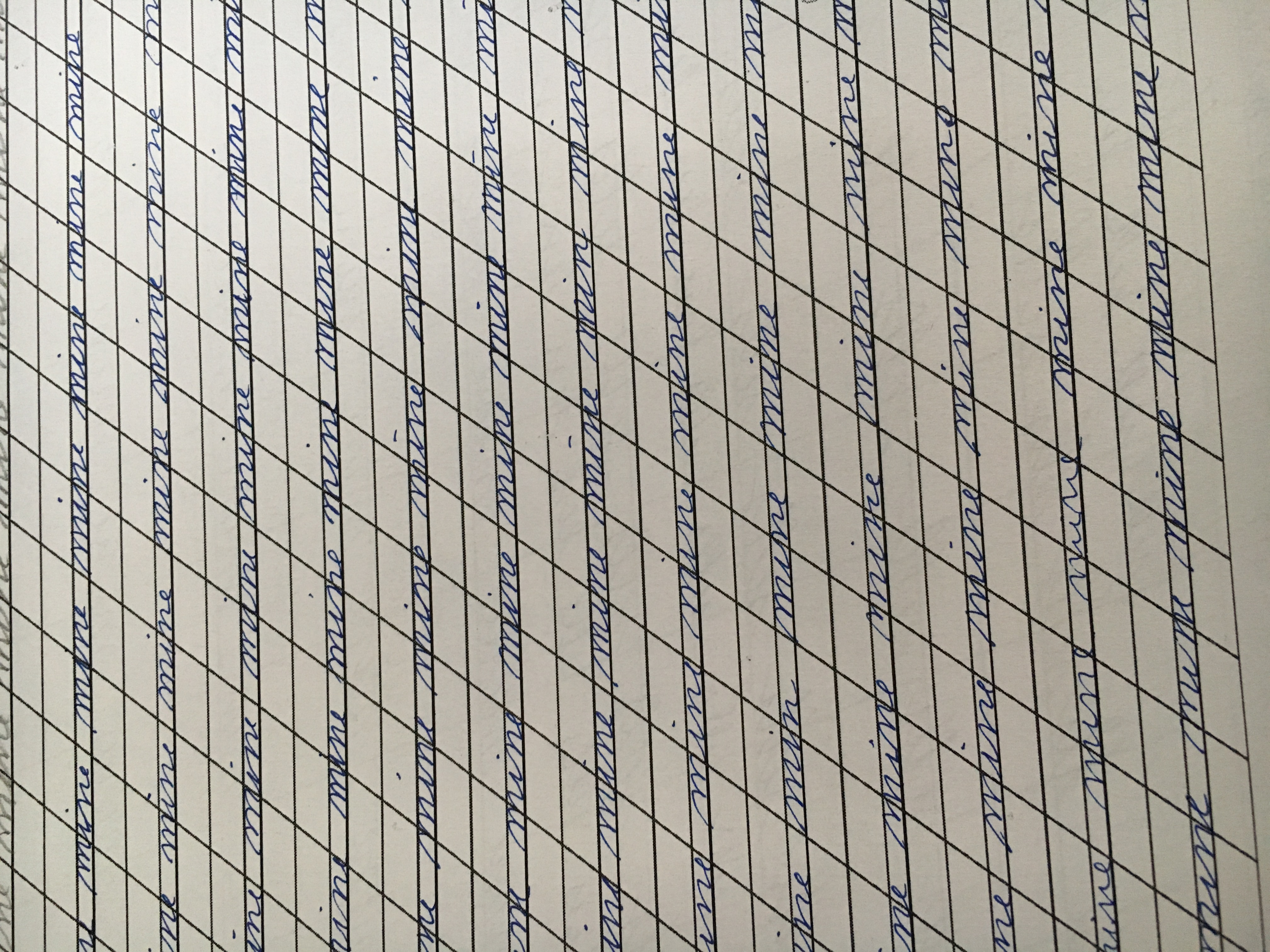 Allego i risultati: dopo qualche esercizio con la falsariga, ho provato una prova a mano senza guide e l'inclinazione delle linee è venuta fuori corretta senza sforzo; non è precisissima, ovviamente, ma ho fatto una prova mettendo i due fogli in controluce ed è abbastanza impressionante. Le guide sono state utilissime!