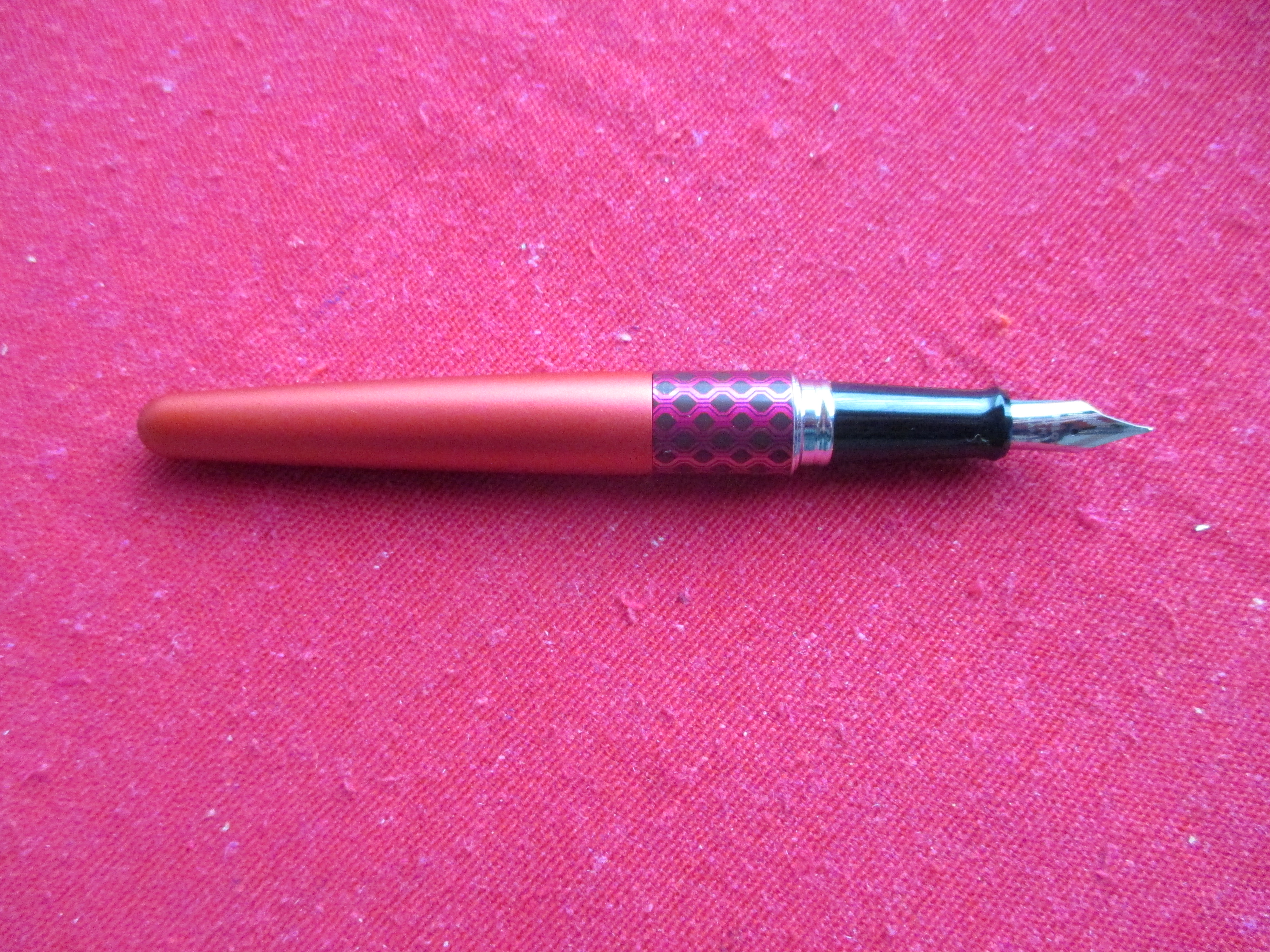 Comprata giusto un mesetto fa nella colorazione viola: il pennino è leggermente più fine dell' F Lamy, ma molto scorrevole dopo qualche pagina di rodaggio. Utilizza cartucce con attacco standard (io uso le Waterman lunghe) ed è, a mio parere, piacevolmente robusta.