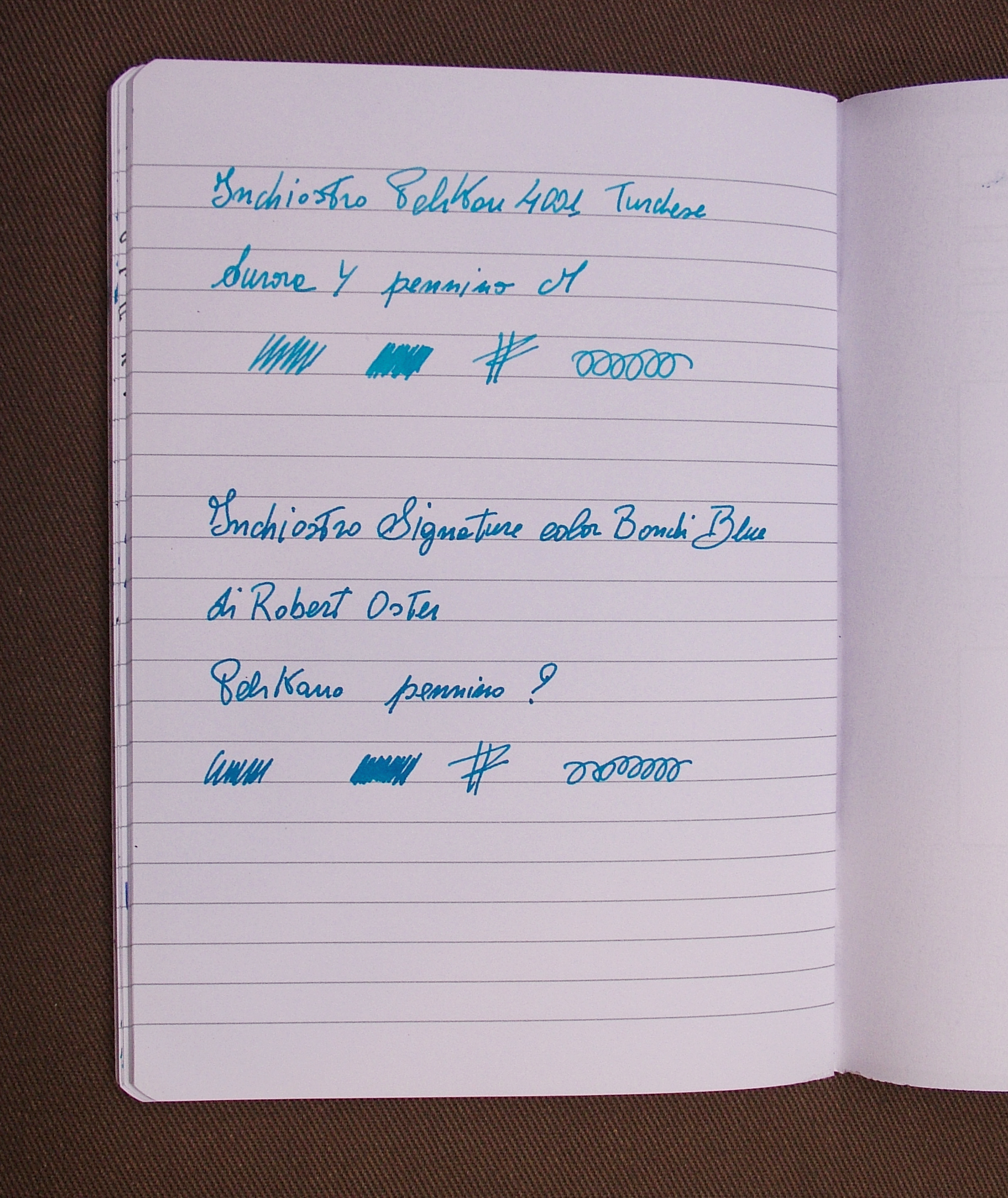 Ho provato a confrontare l' Ooster con il Pelikan 4001 più conosciuto per dare un idea, anche se la fotografia non so fino a che punto riproduce la realtà del colore.