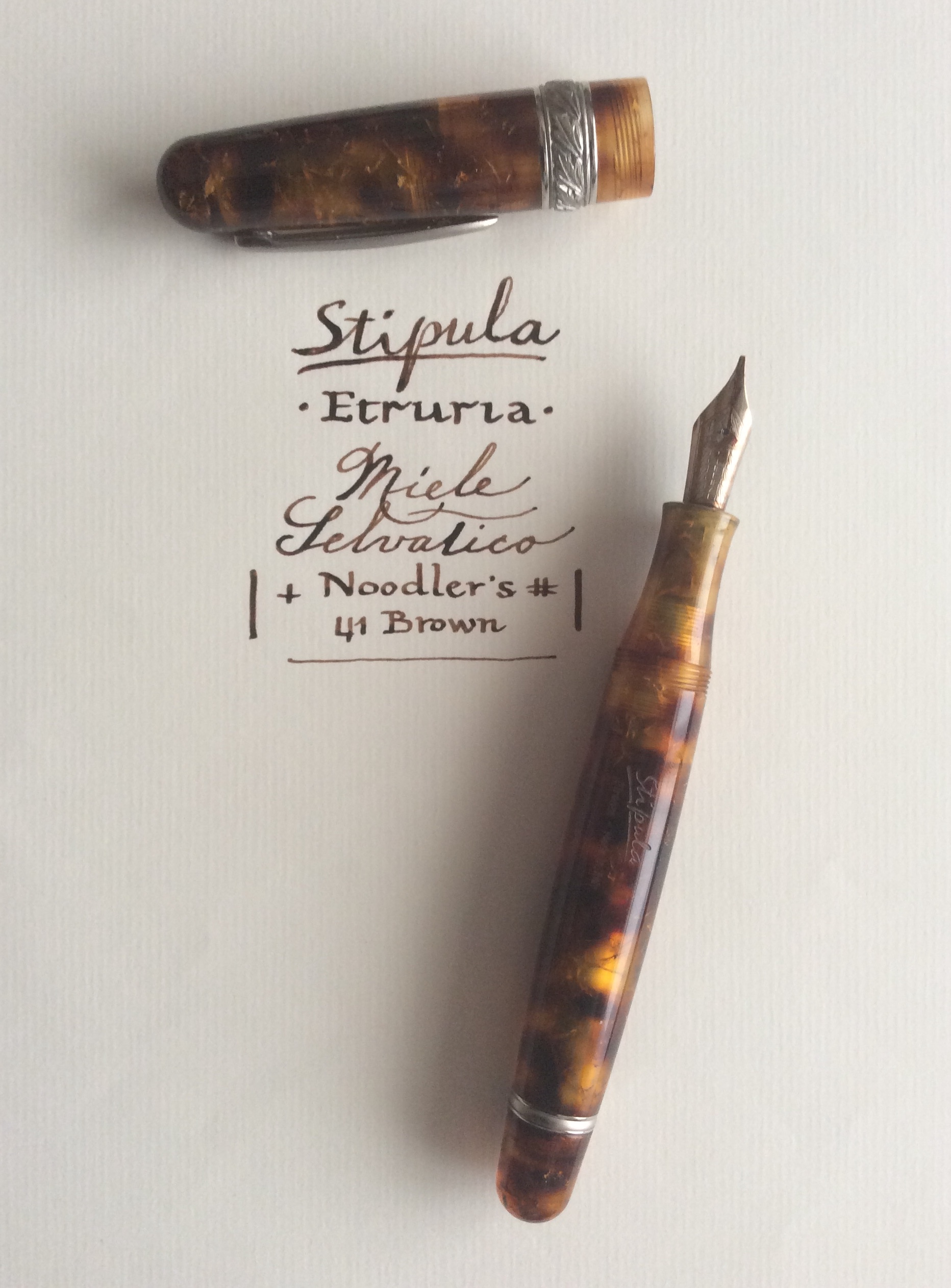 L'Etruria di cui parlerò in questo argomento è un'introduzione piuttosto recente nella serie "Magnifica" realizzata in resine marmorizzate, che oltre alla nostra vedette, la "Miele Selvatico", comprende anche "Sahara" (color sabbia), "Oronero" (nero venato di oro), "Pirite"(nero marmorizzato, bianco e giallo crema), "Avorio" e "Onice" (nero). Come con molti altri modelli recenti di penne Stipula, le informazioni disponibili su questa serie sono scarse, così come una panoramica generale dell'attività del marchio, che può essere definita in qualche modo irregolare.