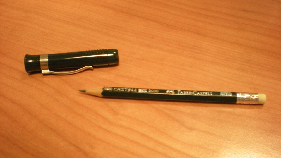 Porto sempre con me una matita con allunga lapis in plastica verde (Faber Castell matita perfetta) e una stilografica con inchiostro nero, mentre sul mio tavolo da lavoro non mancano mai matite colorate e inchiostri colorati.