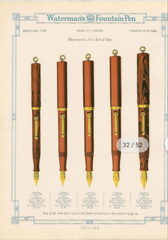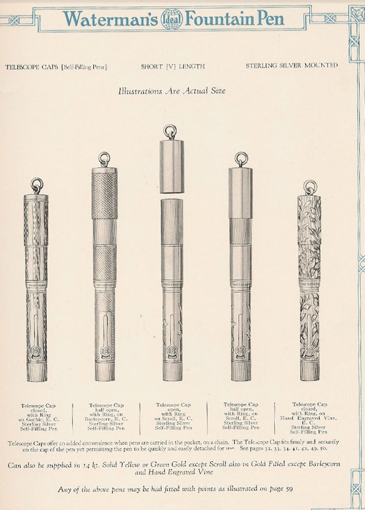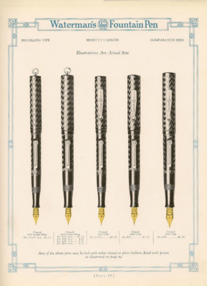 Queste sono le penne con l'anellino sul cappuccio (ring top) di Waterman nel 1925.