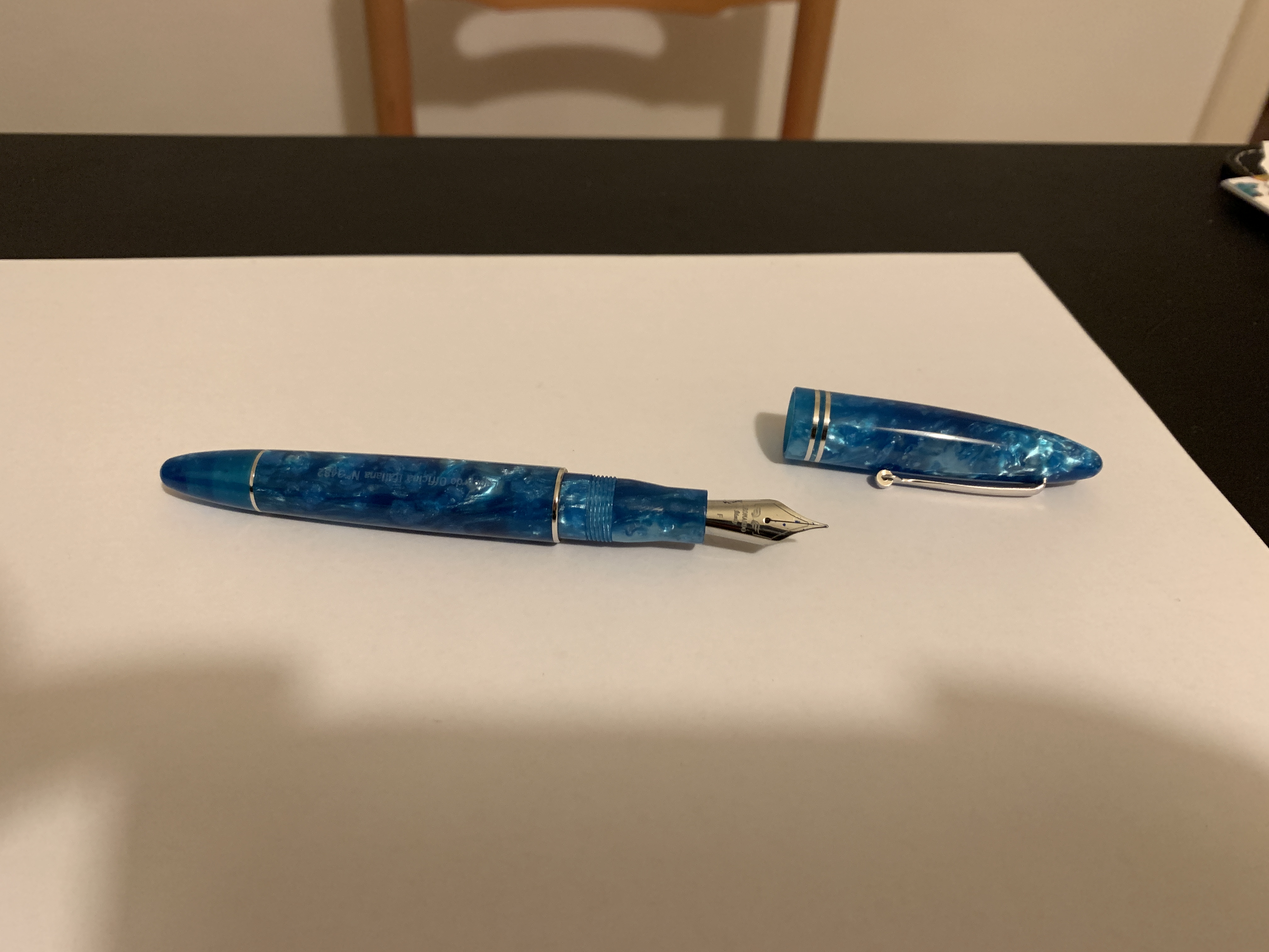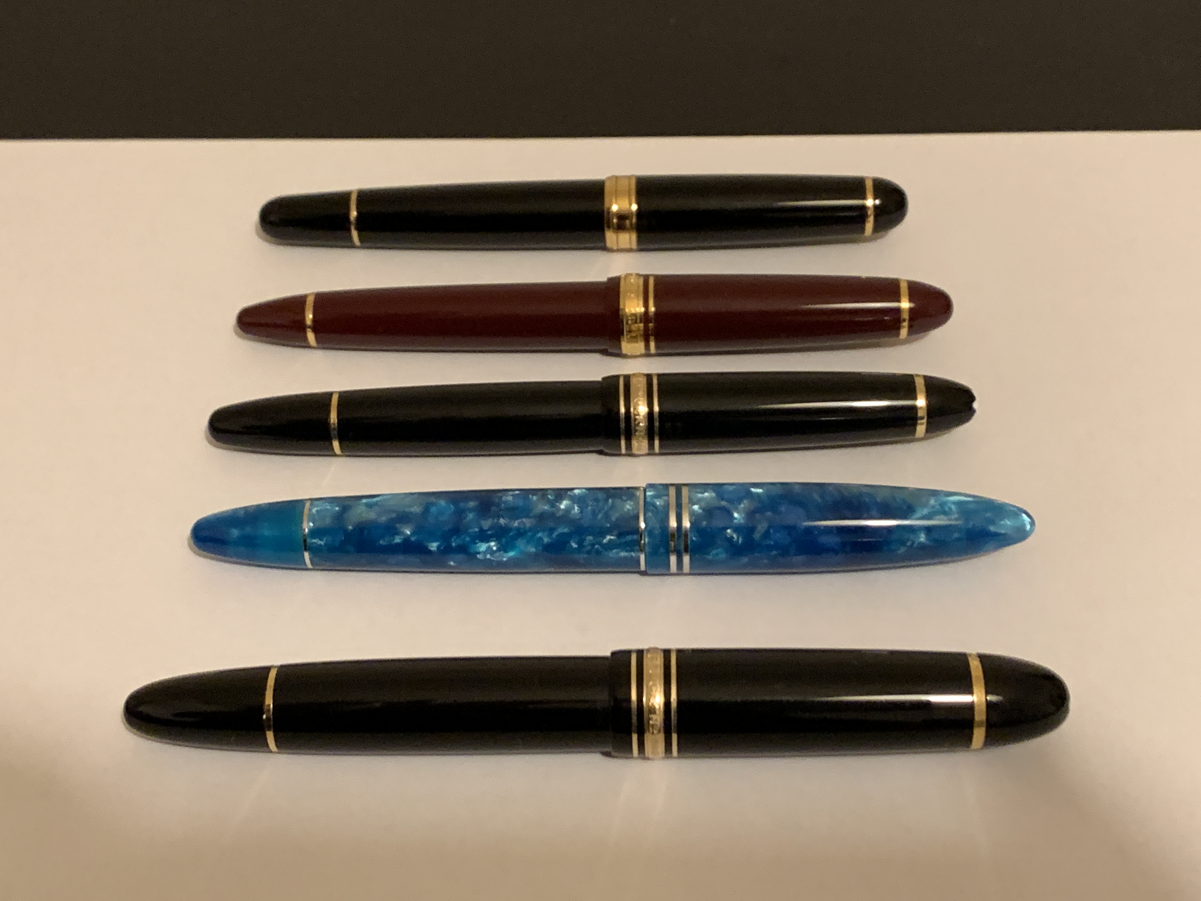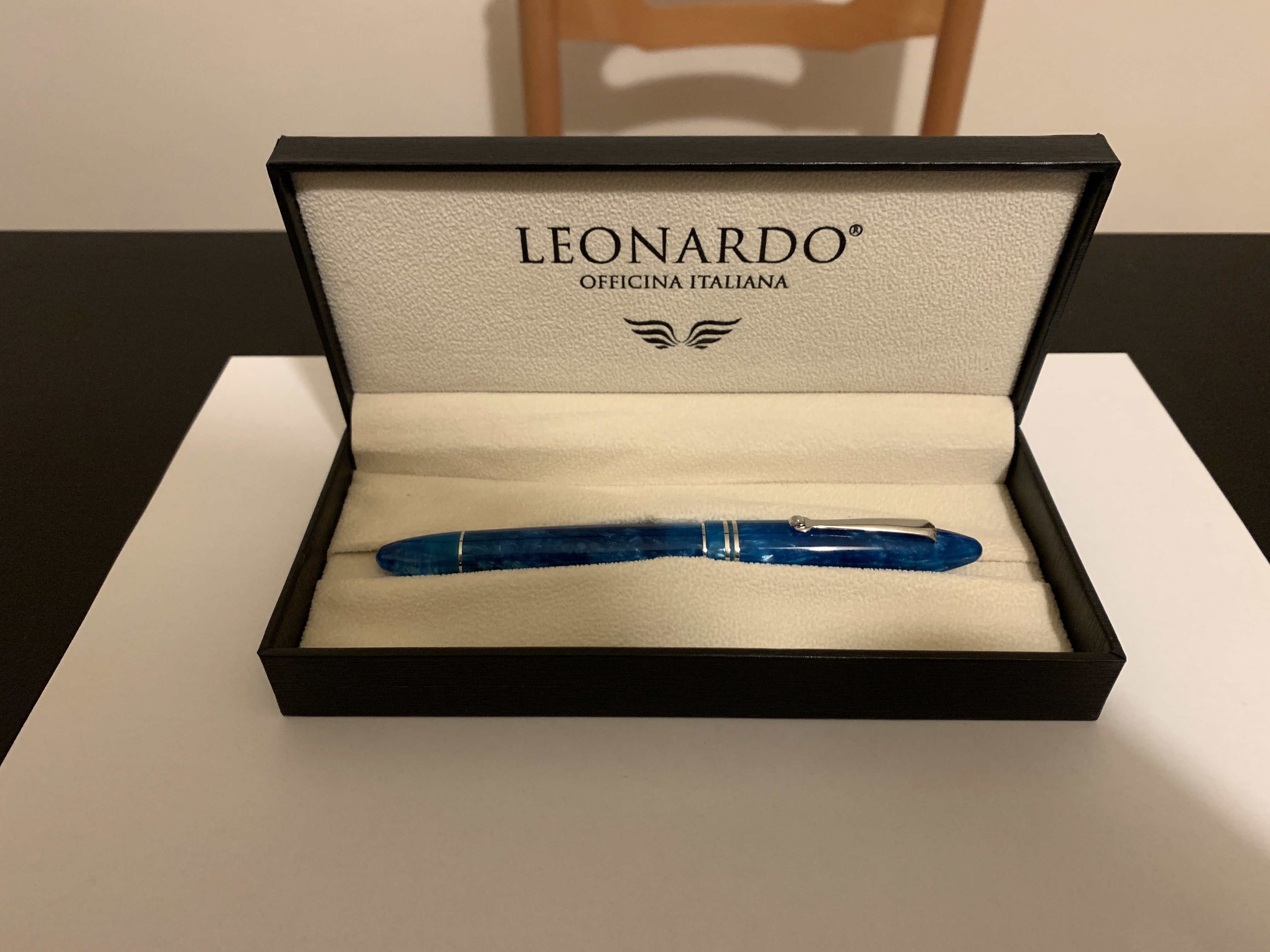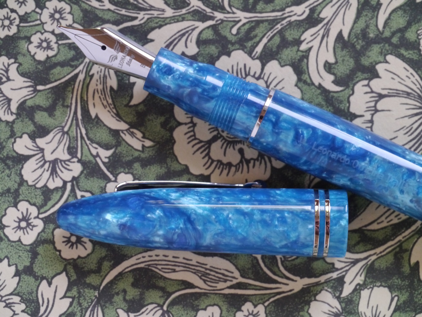 Per confronto inserisco una foto con alcune delle penne che possiedo con, dall'alto in basso: Aurora 88 big, Sailor 1911 Large, Montblanc 146, Leonardo Officine Italiana Furore, Montblanc 149. Mentre la forma è decisamente in linea con le altre è sicuramente quella che spicca per fantasia del colore