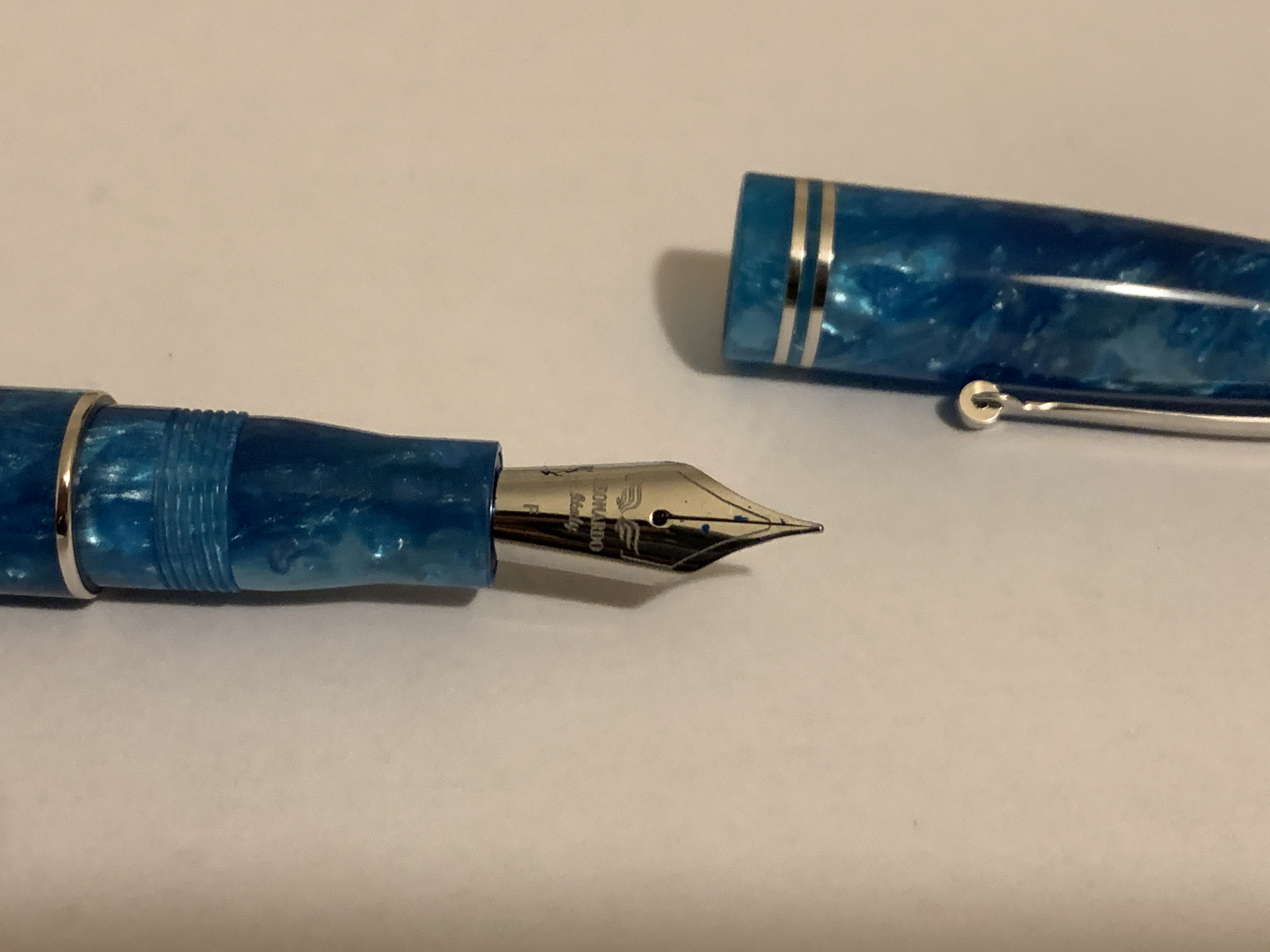 Aperta la scatola ecco svettare, su panno bianco, la bellissima resina della penna. La forma è a sigaro. Il sistema di caricamento è un converter avvitato che può essere caricato anche ruotando il fondello del corpo della penna. Il colore da me scelto è il Tourquoise o Smeraldo con finiture cromate: mi ha colpito quando ho visto la penna in vetrina e nemmeno la Furore Grande in colorazione Dark Hawaii (che trovo molto bella) mi ha fatto desistere. Era come se fosse il colore che volevo esattamente in quel momento per quella penna che si associasse agli eventi che festeggiavo.