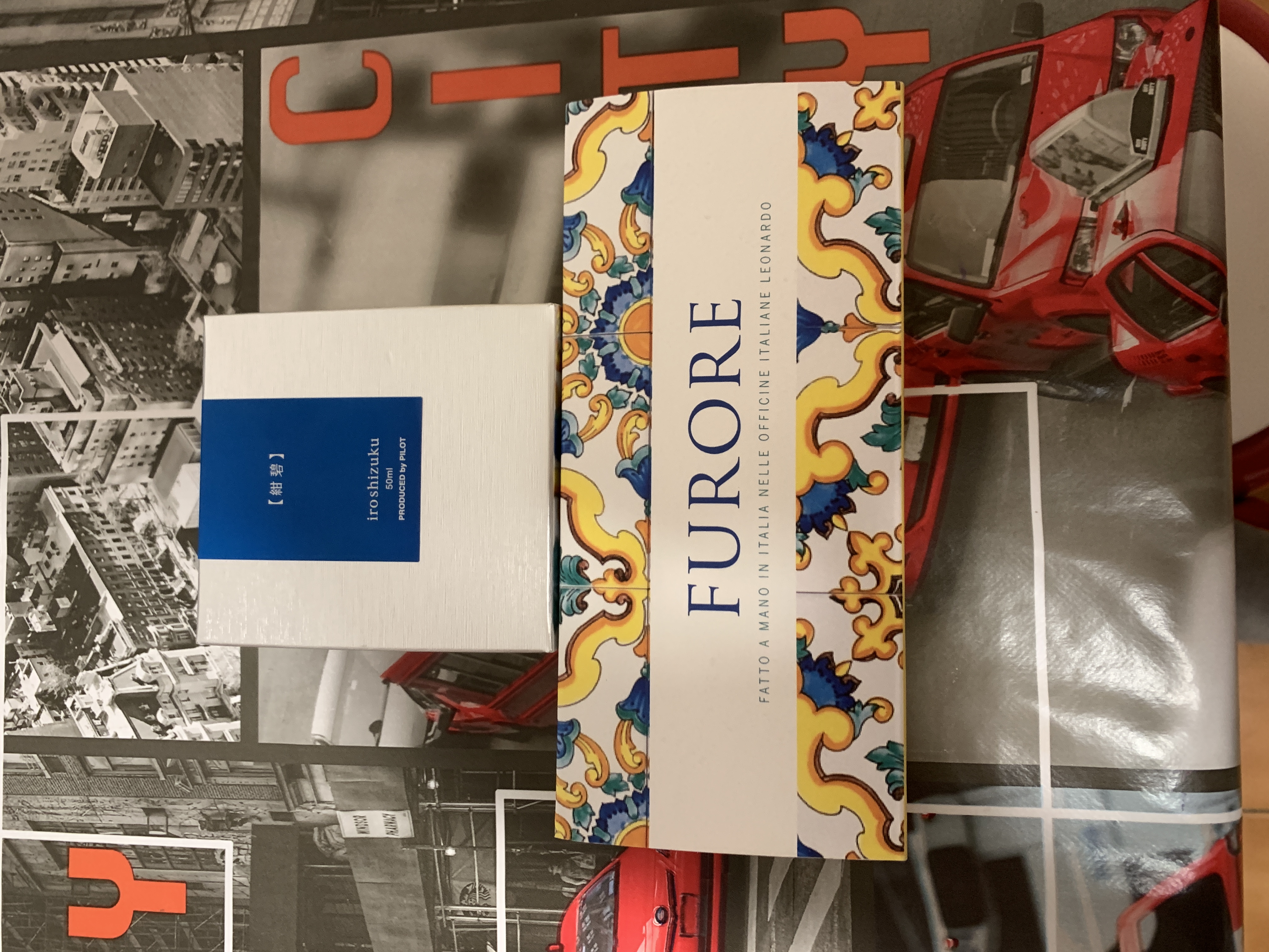 Partiamo dalla confezione, inizialmente fotografata accanto alla boccetta di Pilot Iroshizuku Kon Peki che ho intenzione di dedicare alla penna in questione. La scatola vera e propria è avvolta da due controscatole in cartoncino, una prima con una stampa personalizzata per il modello "Furore" e una seconda in nero opaco con stampato in nero il nome della ditta produttrice.