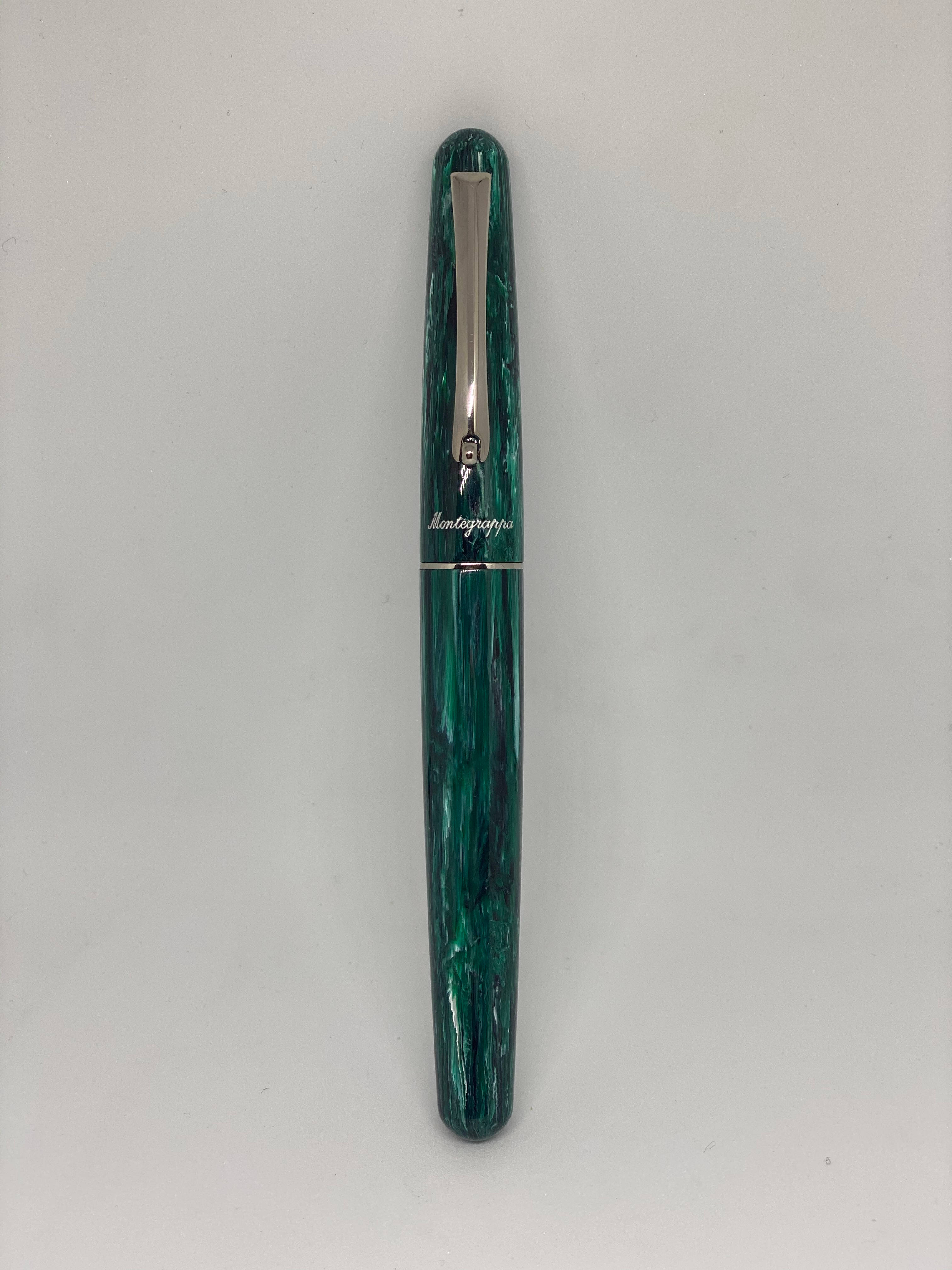 La scritta Montegrappa alla base del cappuccio è incisa nella resina ed e l’altro elemento che caratterizza questa penna.