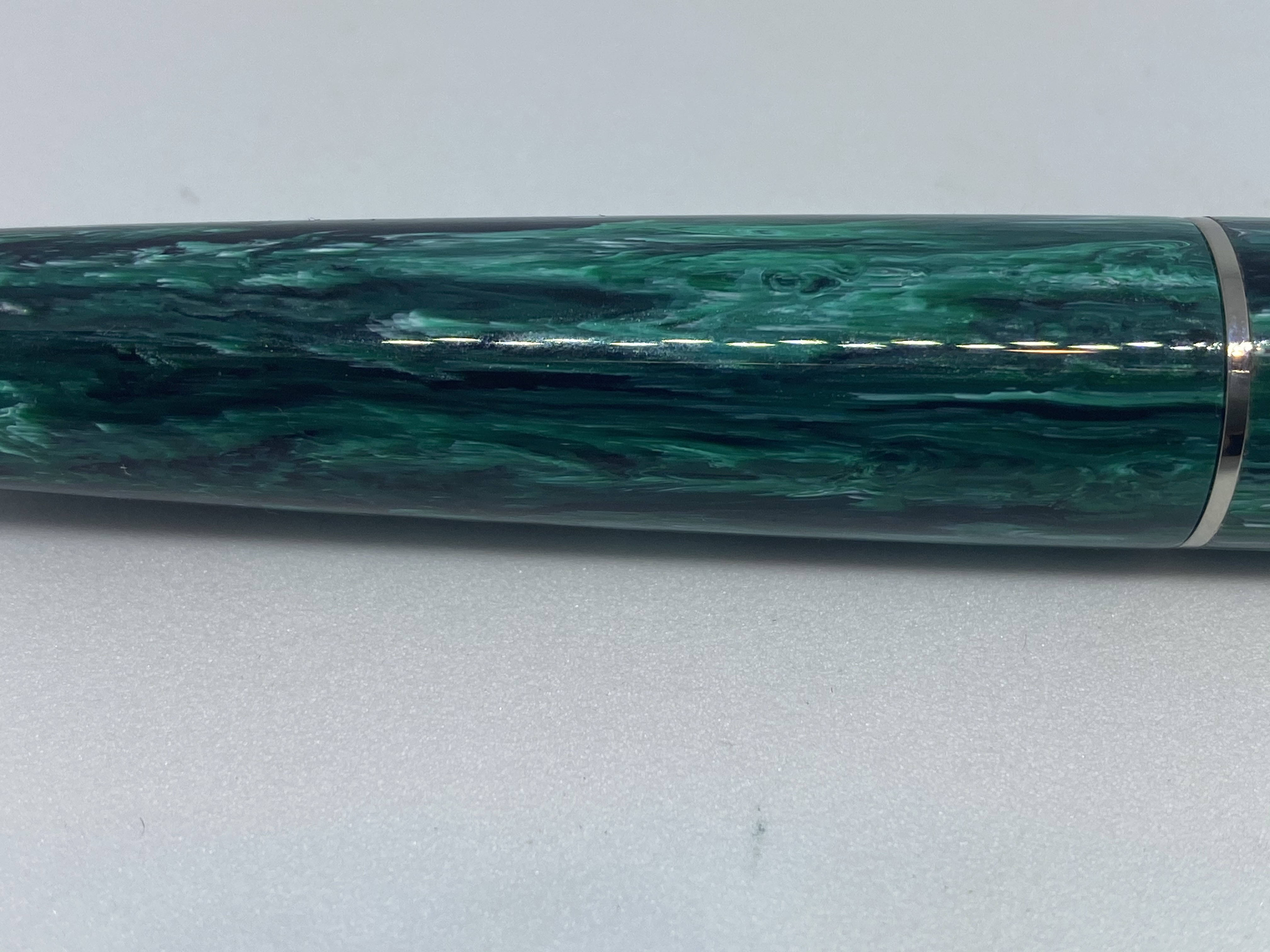 La Elmo 01, è una penna semplice ed efficiente, ed è da questo che si vede il legame con l’Ing. Helm, da cui viene proprio la denominazione Elmo, che si ispirò ai dettami della scuola Bauhaus e del movimento modernista nelle sue realizzazioni. La penna ha delle linee molto pulite, è di taglia media, usa un buon gruppo di scrittura in acciaio JoWo ed implementa un efficace sistema di ricarica a cartuccia/converter. Personalmente era da molto che puntavo ad una Elmo, poi questa edizione limitata con una delle nuove resine note come Montegrappite, mi ha fatto decidere all’acquisto. La versione specifica è la Elmo Chrysocolla, prodotta in soli 300 esemplari per un eShop statunitense.
